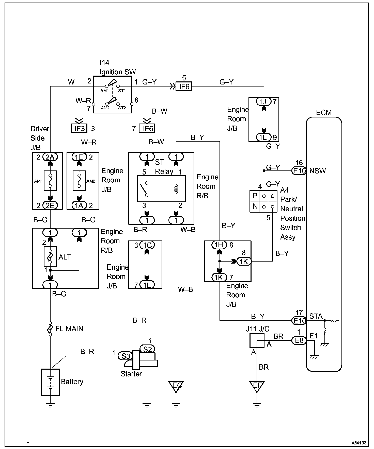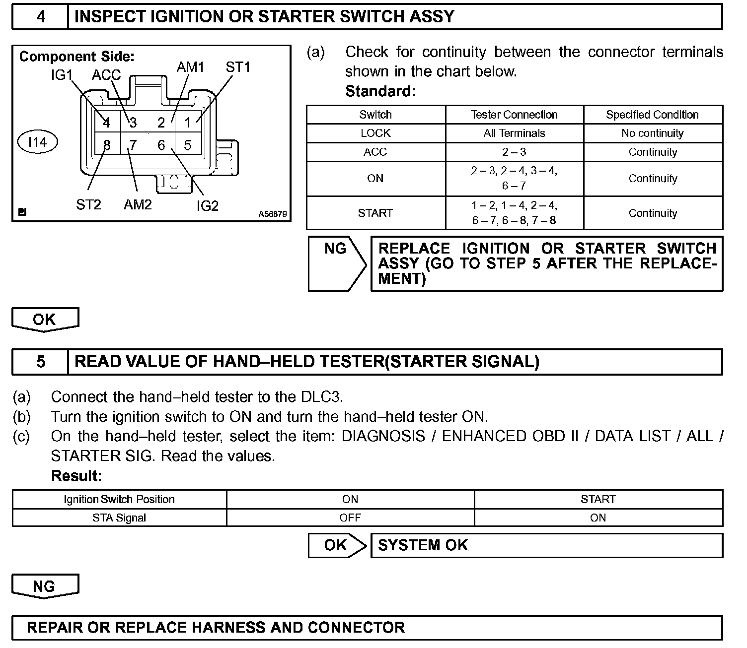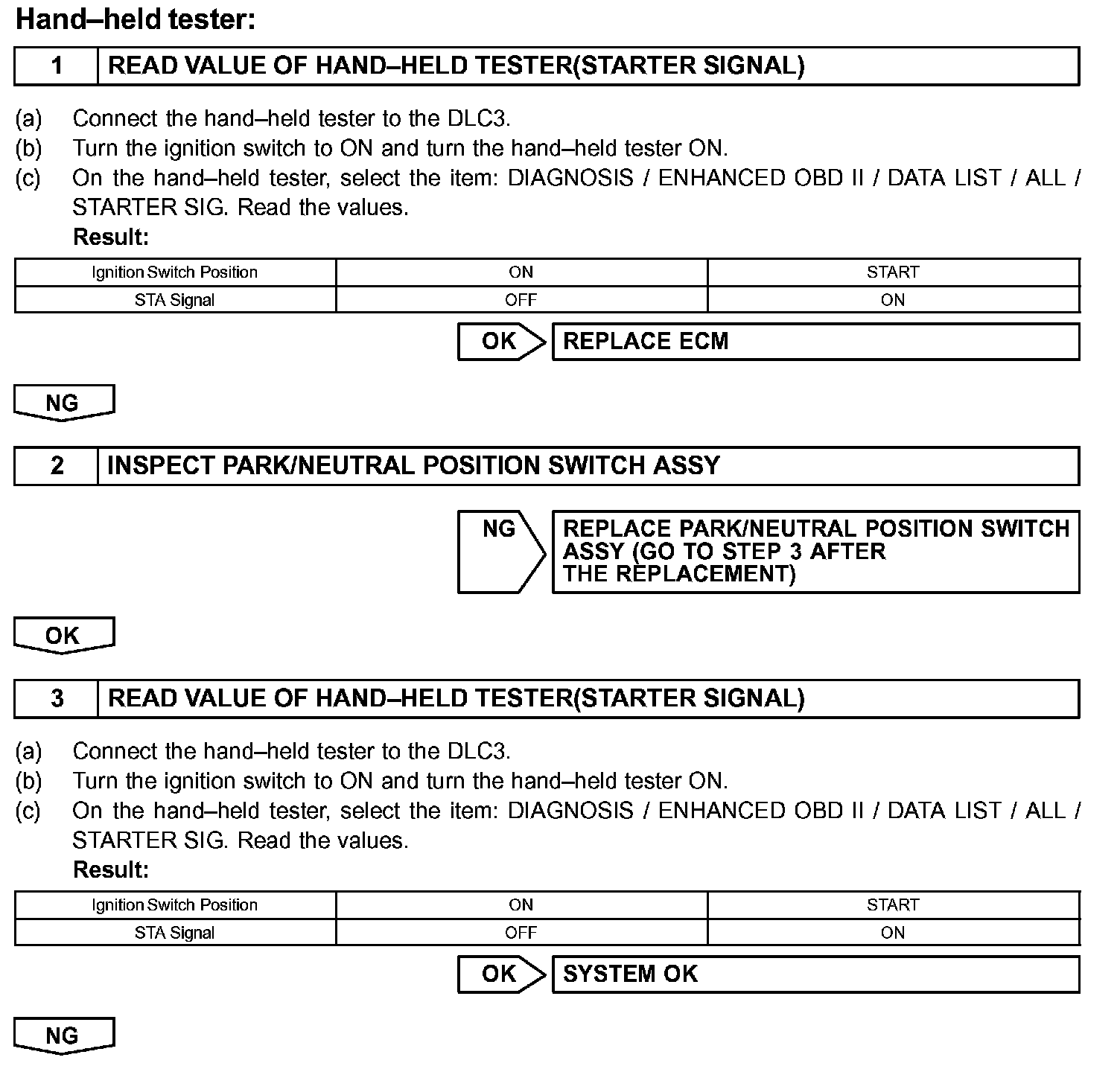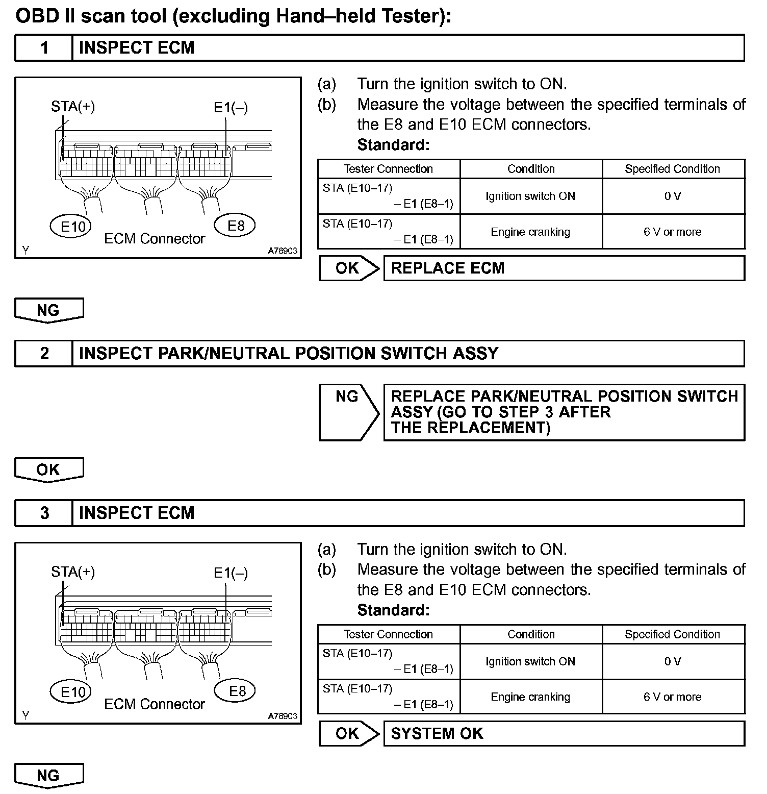 If the vehicle is being driven and the ECM detects the starter control signal (STA), the ECM concludes that the starter control circuit is malfunctioning. The ECM will turn on the MIL and a DTC is set.