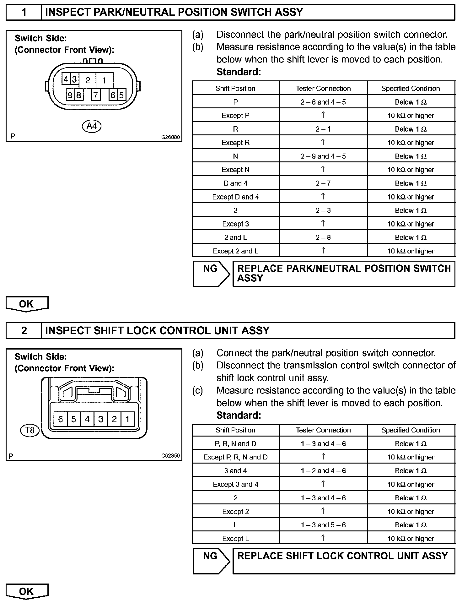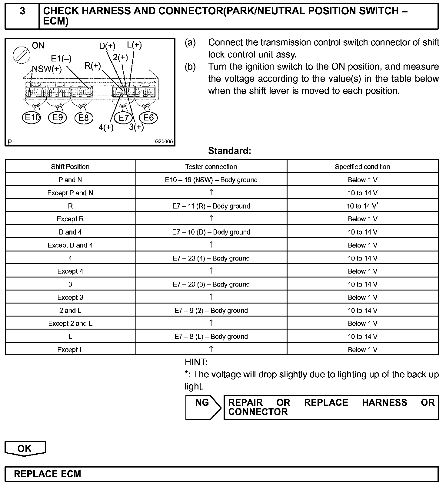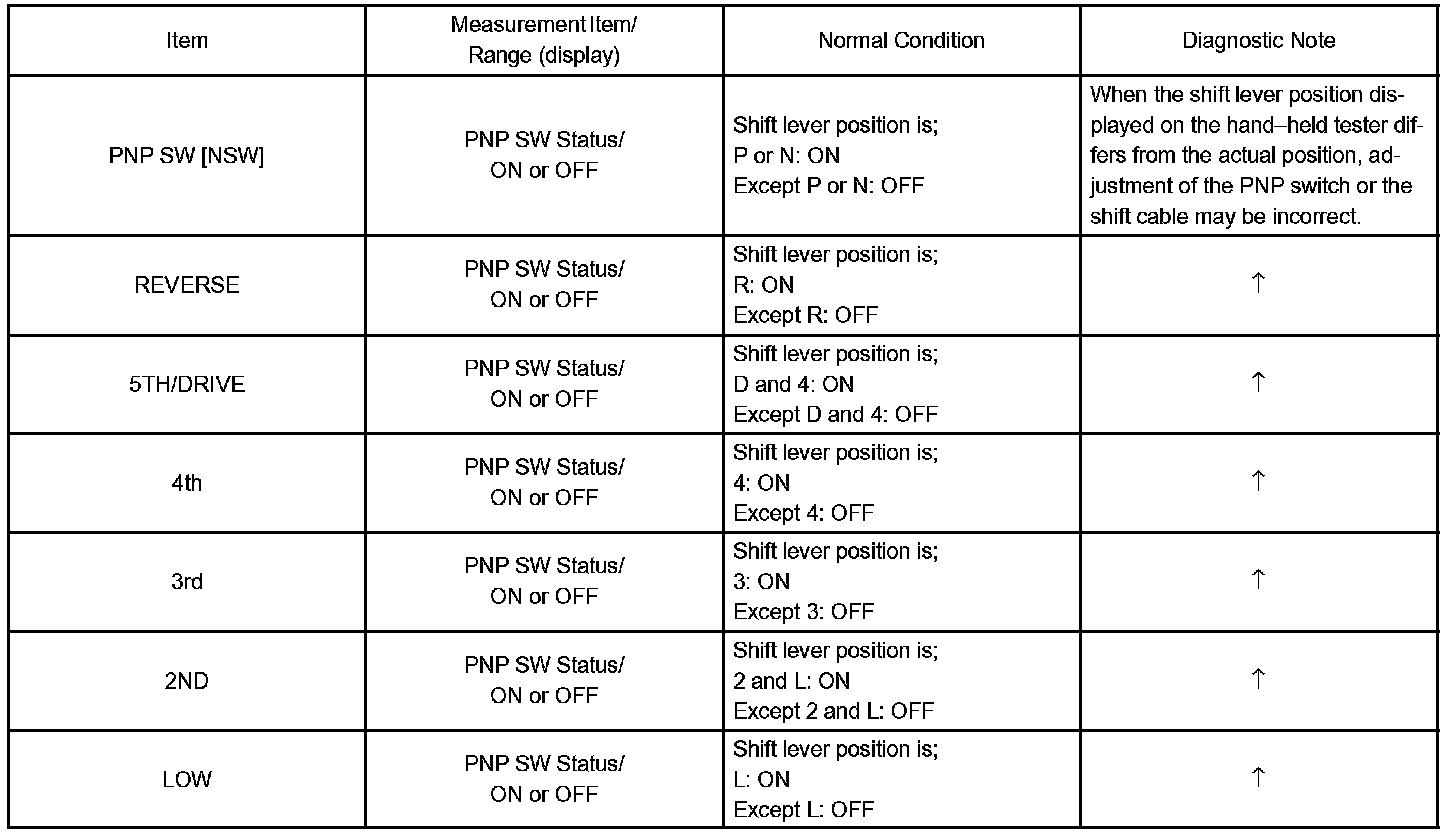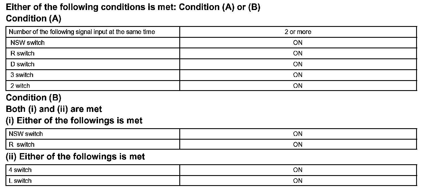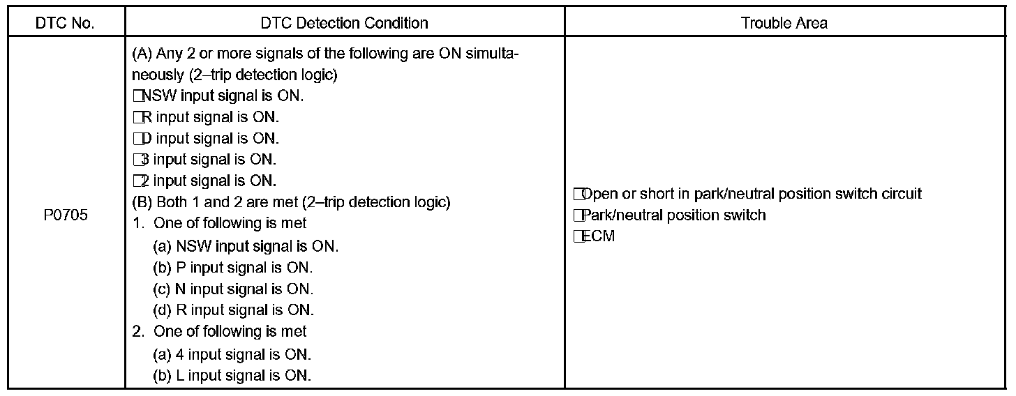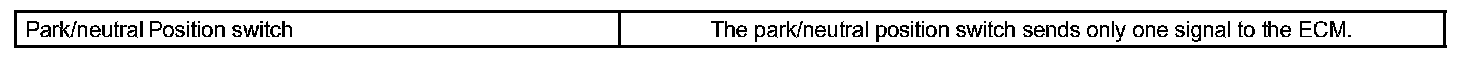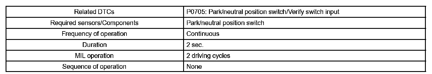 When the park/neutral position switch sends more than one signal at a time from switch positions P, R, N or D, the ECM interprets this as a fault in the switch. The ECM will turn on the MIL and store the DTC.