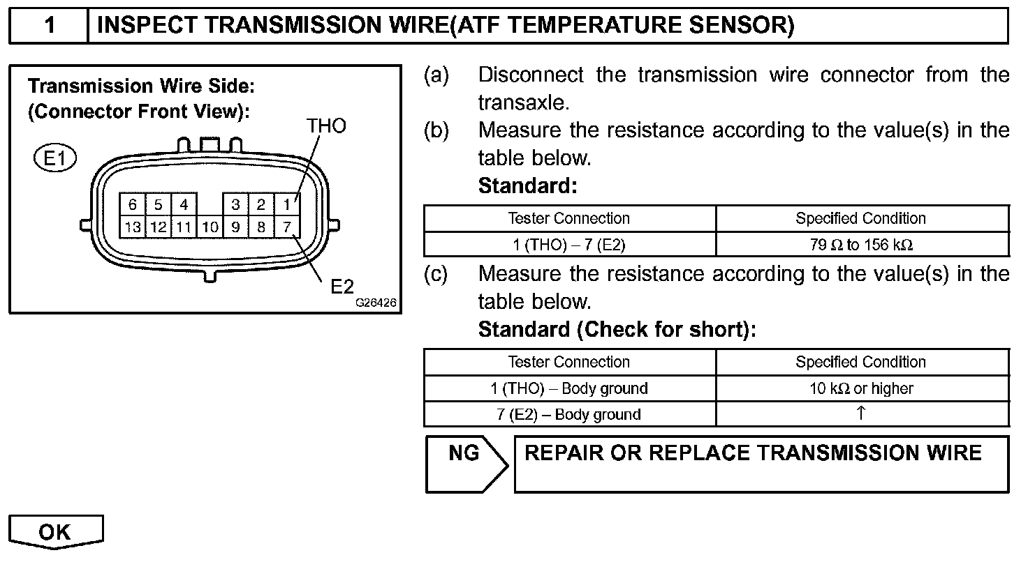 The sensor resistance changes with the transmission fluid temperature. As the temperature becomes higher, the sensor resistance decreases.