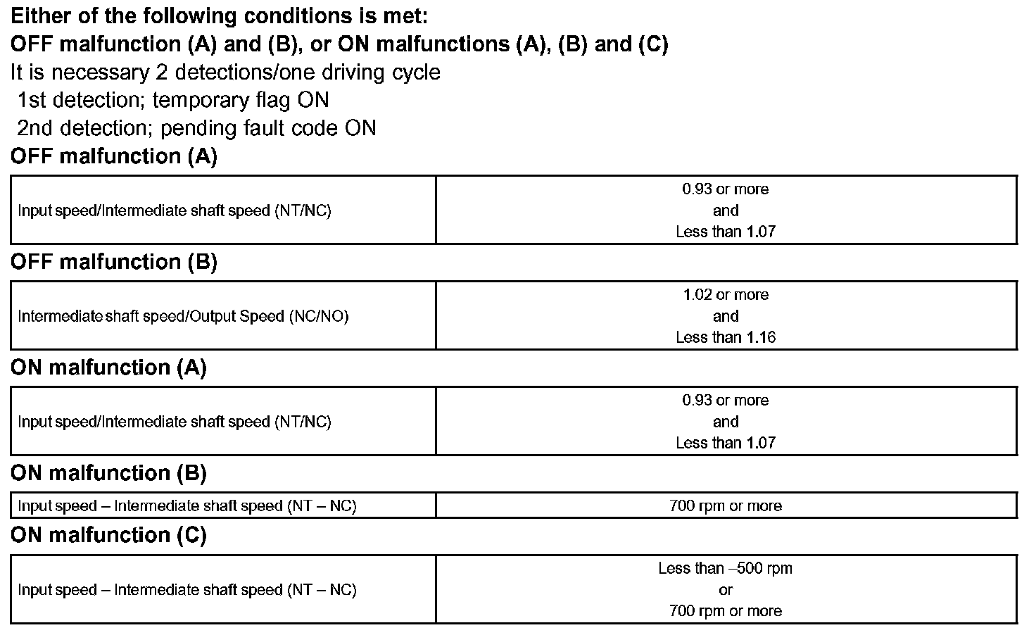 The ECM commands gear shifts by turning the shift solenoid valves "ON/OFF". According to the input shaft revolution, intermediate (counter) shaft revolution and output shaft revolution, the ECM detects the actual gear position (1st, 2nd, 3rd, 4th or 5th gear position). When the gear position commanded by the ECM and the actual gear position are not same, the ECM illuminates the MIL and stores the DTC.