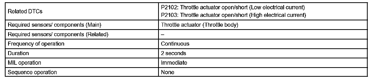 The ECM monitors the flow of electrical current through the electronic throttle motor, and detects malfunctions or open circuits in the throttle motor based on the value of the electrical current. When the current deviates from the standard values, the ECM concludes that there is a fault in the throttle motor. Or, if the throttle valve is not functioning properly (for example, stuck ON) the ECM concludes that there is a fault and turns on the MIL and a DTC is set.