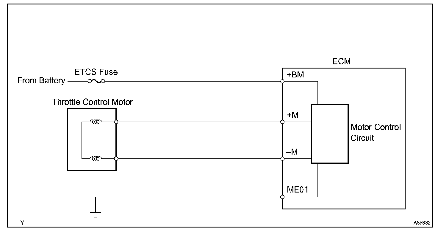The Electronic Throttle Control System (ETCS) has a dedicated power supply circuit. The voltage (+BM) is monitored and when the voltage is low (less than 4 V), the ECM concludes that the ETCS has a fault and current to the throttle control motor is cut.