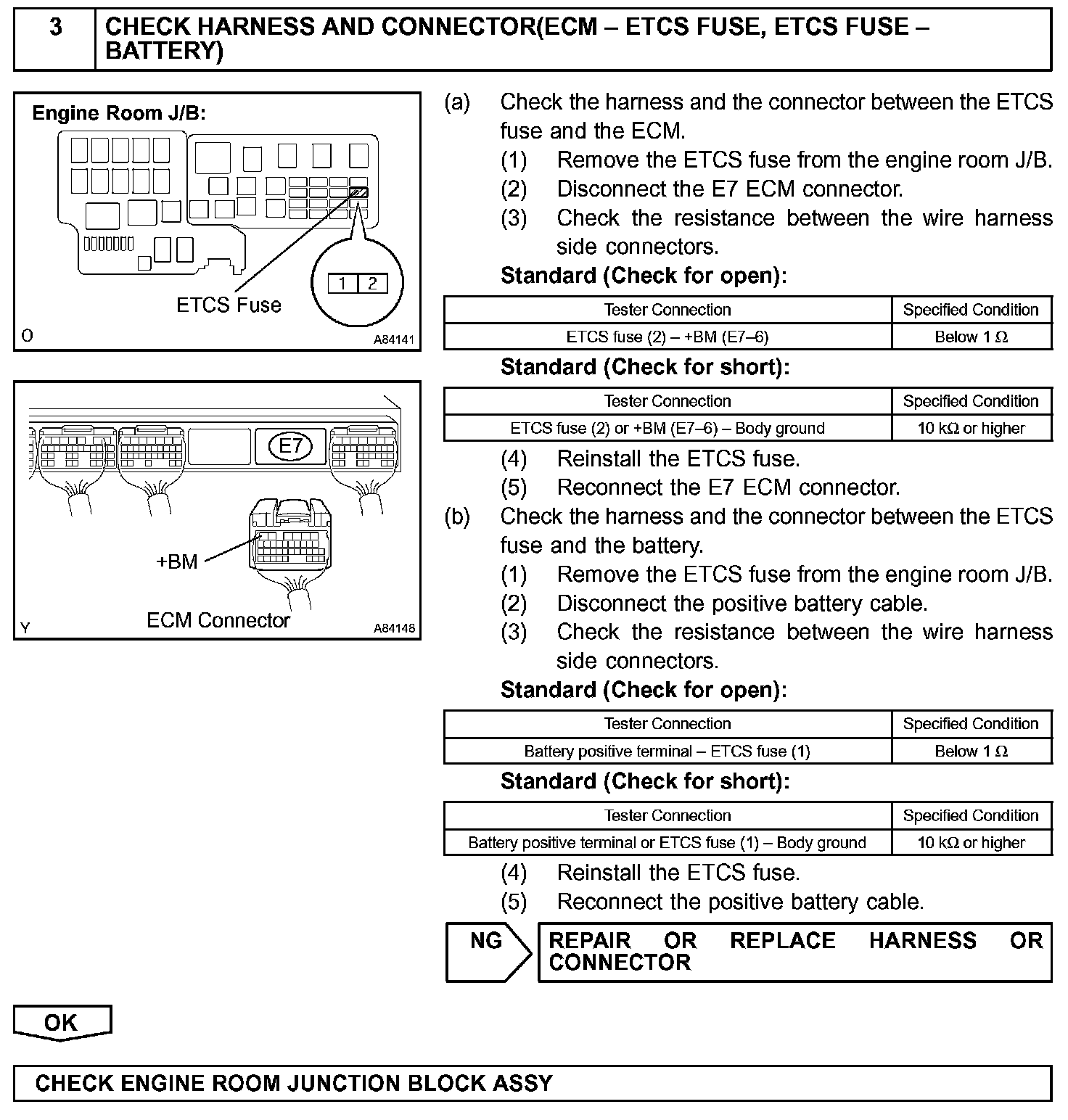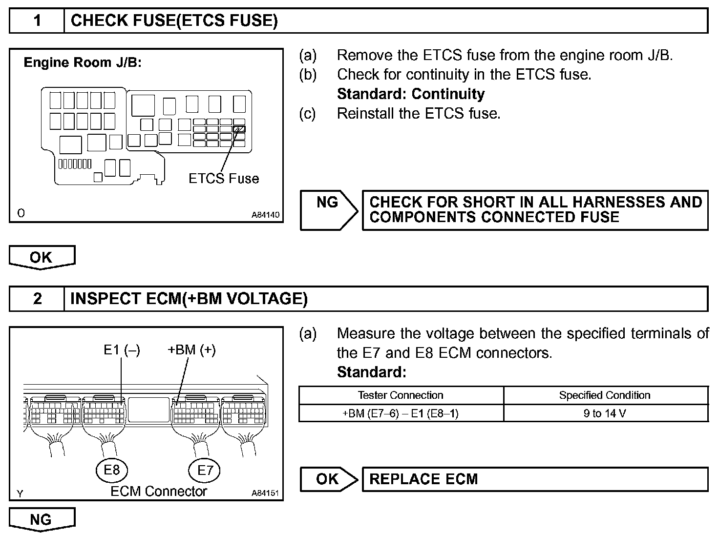 When the voltage becomes unstable, the ETCS itself becomes unstable. For this reason, when the voltage is low, the current to the motor is cut. If repairs are made and the system has returned to normal, turn the ignition switch to OFF. The ECM then allows current to flow to the motor and the motor can be restarted.