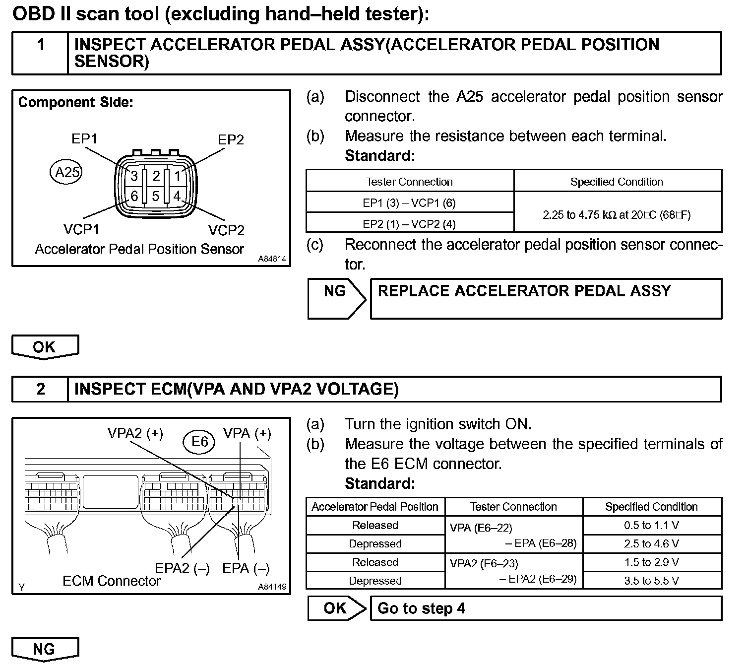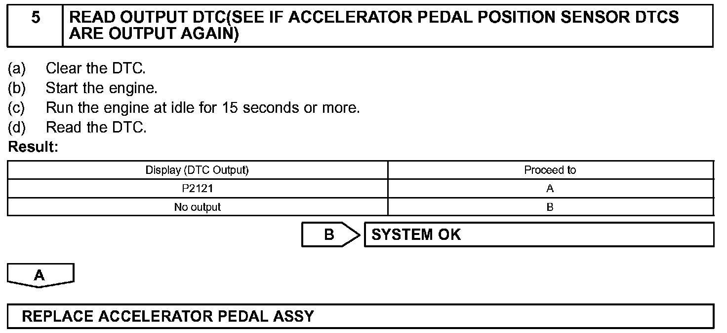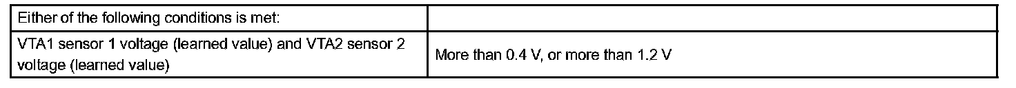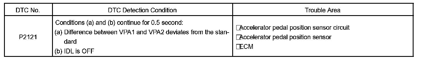 The accelerator pedal position sensor is mounted on the accelerator pedal bracket. The accelerator pedal position sensor has 2 sensor elements / signal output: VPA1 and VPA2. VPA1 is used to detect the actual accelerator pedal angle (used for engine control) and VPA2 is used to detect malfunctions in VPA1. When the difference between the voltage output of VPA1 and VPA2 deviates from the standard, the ECM concludes the accelerator pedal position sensor has a malfunction. The ECM turns on the MIL and a DTC is set.