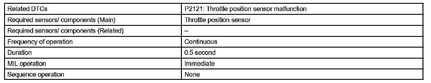 The accelerator pedal position sensor has two (main and sub) sensor circuits. If a malfunction occurs in either of the sensor circuits, the ECM detects the abnormal signal voltage difference between the two sensor circuits and switches to limp mode. In limp mode, the functioning circuit is used to calculate the accelerator pedal opening angle to allow the vehicle to continue driving. If both circuits malfunction, the ECM regards the opening angle of the accelerator pedal to be fully closed. In this case, the throttle valve will remain closed as if the engine was idling.
