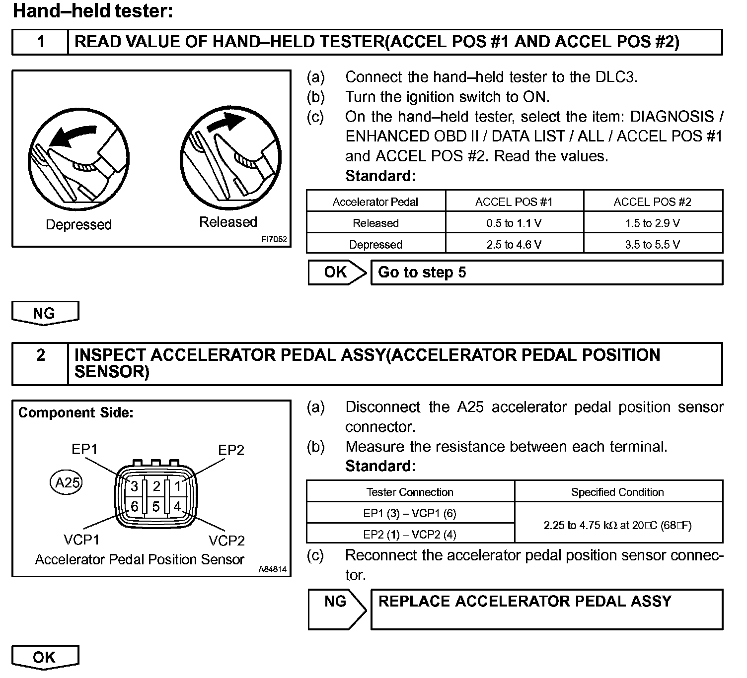 The accelerator pedal position sensor is mounted on the accelerator pedal bracket. The accelerator pedal position sensor has 2 sensor elements / signal output: VPA1 and VPA2. VPA1 is used to detect the actual accelerator pedal angle (used for engine control) and VPA2 is used to detect malfunctions in VPA1. Voltage change of VPA1 and VPA2 change between 0 V and 5 V depending on the accelerator pedal angle.