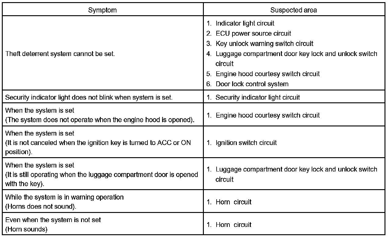 HINT: Troubleshooting of the theft deterrent system is based on the premise that the door lock control system is operating normally. Accordingly, before troubleshooting the theft deterrent system, first make certain that the door lock control system is operating normally.