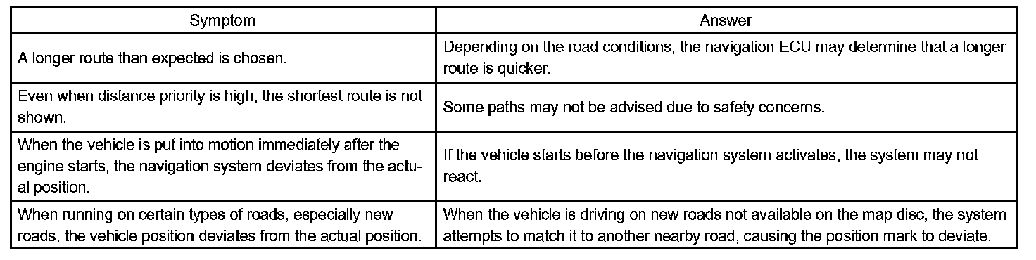 b. The following symptoms are not a malfunction, but are caused by errors inherent in the GPS, gyro sensor, speed sensor, and navigation ECU.