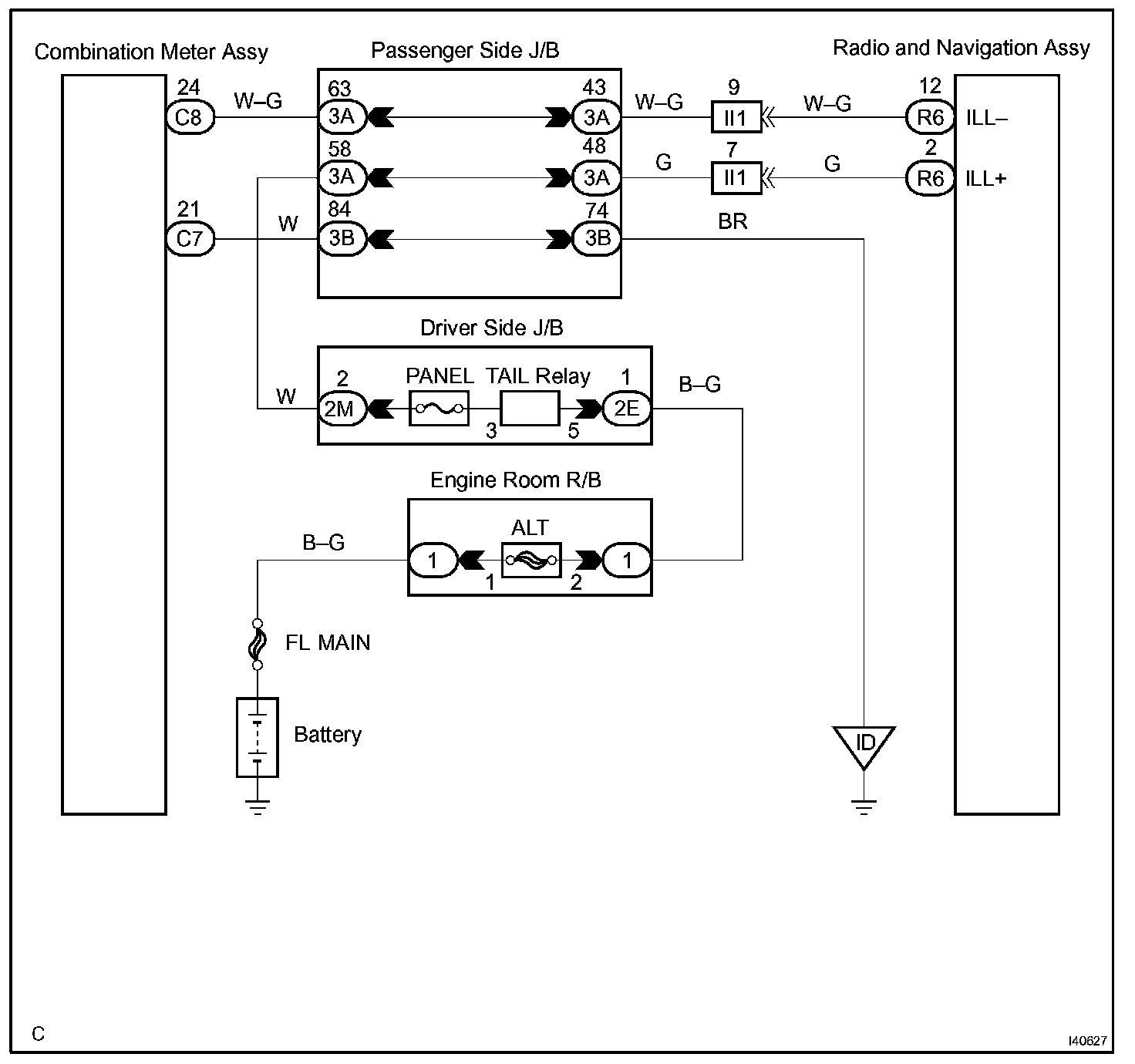 Receiving the dimmer signal from the tail relay, the radio and navigation assy dims the display and illuminates the panel switches.