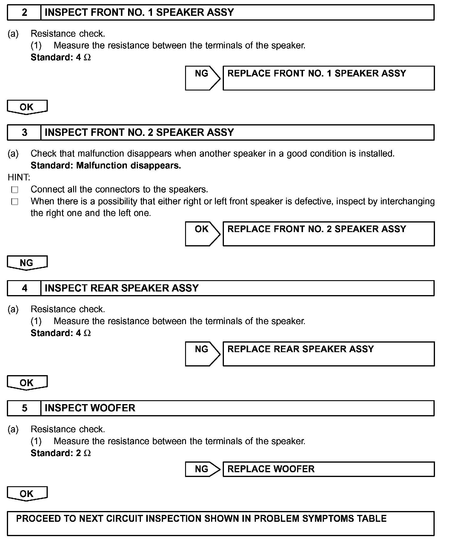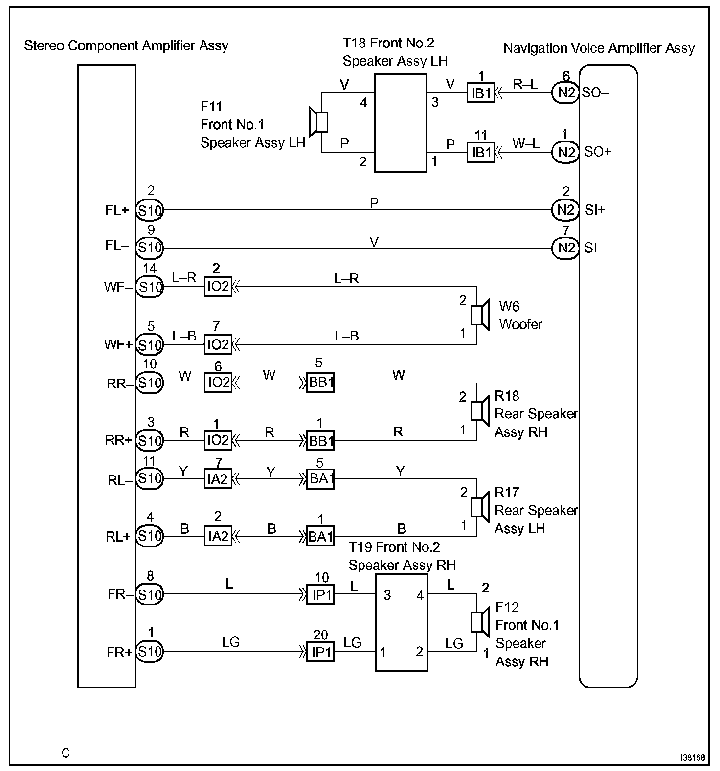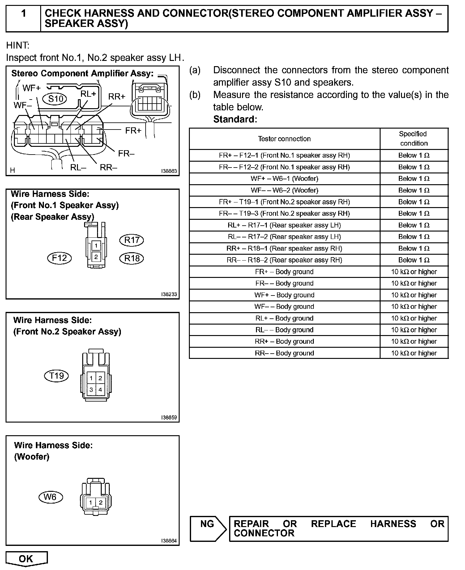 If there is a short in this circuit, the stereo component amplifier assy detects it and stops output to the speaker. Thus sound can not be heard from the speaker even if there is no malfunction in the stereo component amplifier assy or speaker.