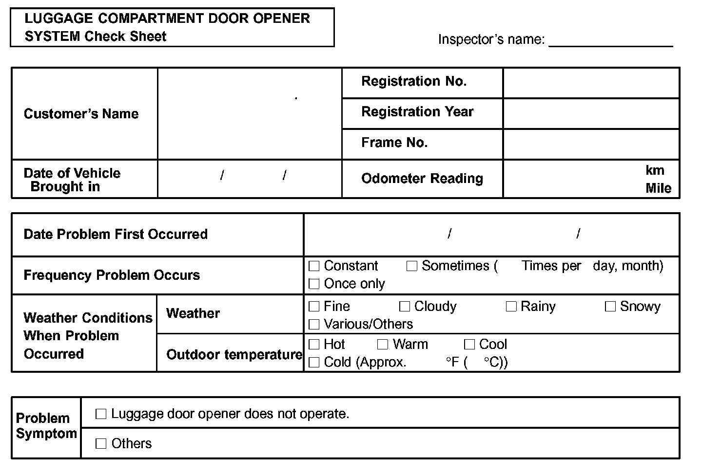 Luggage Compartment Door Opener System Check Sheet: