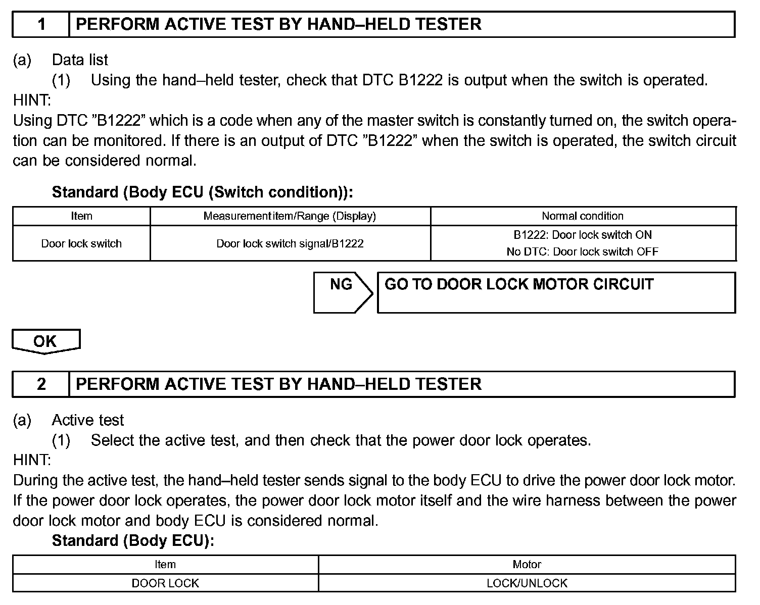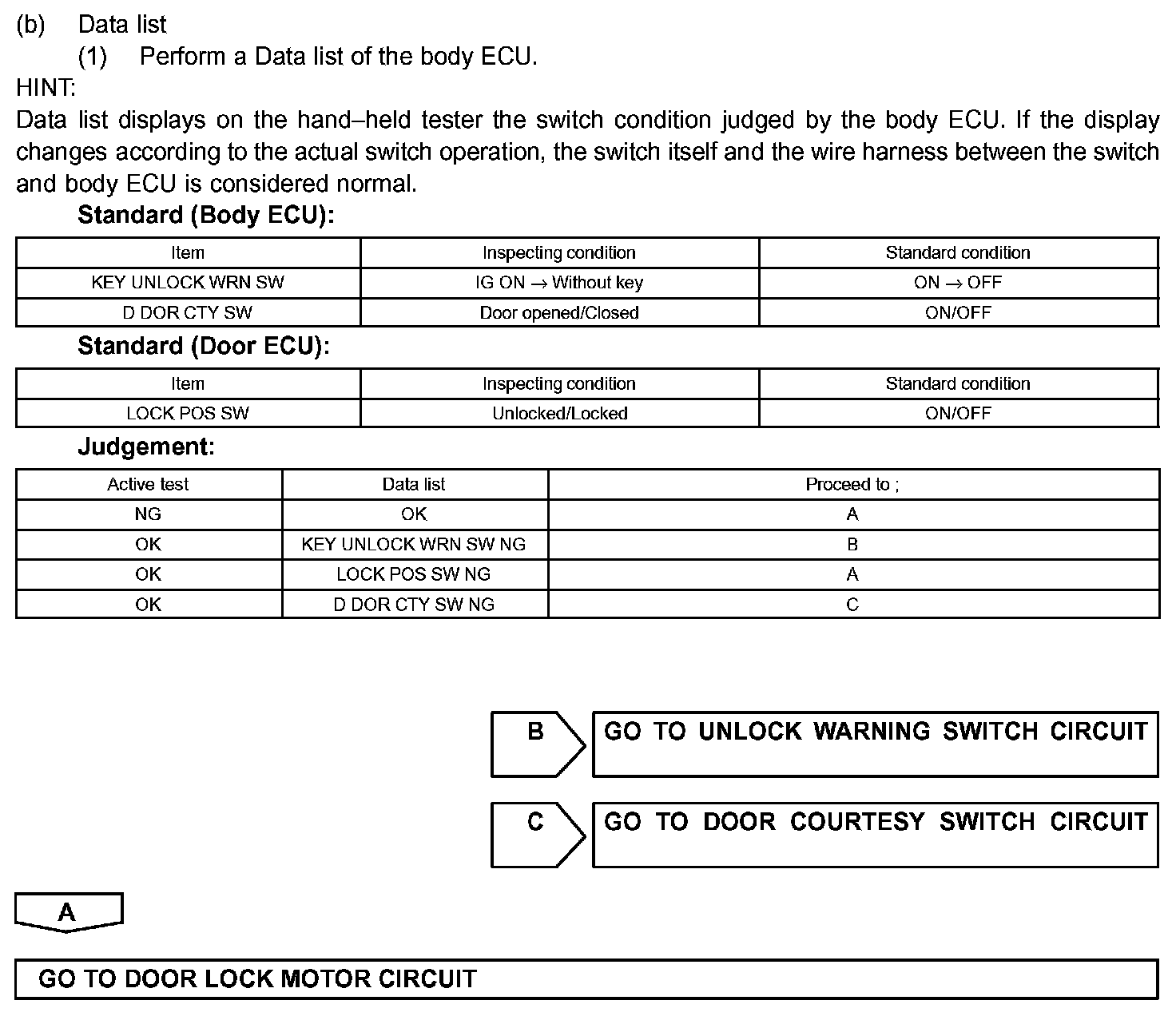 NOTE: Power door lock system use a large-scale body multiplex communications. First of all, confirm the communication function depending on the "how to proceed with troubleshooting", and check that there is no abnormality in the communication system. Then finally proceed with the troubleshooting. Confirm the diagnostic code before troubleshooting.