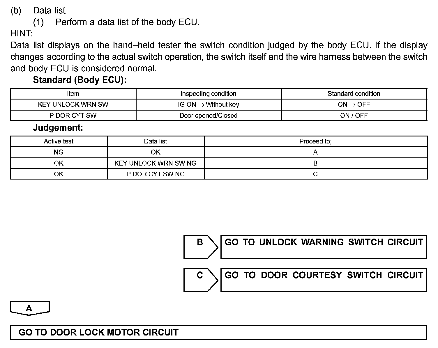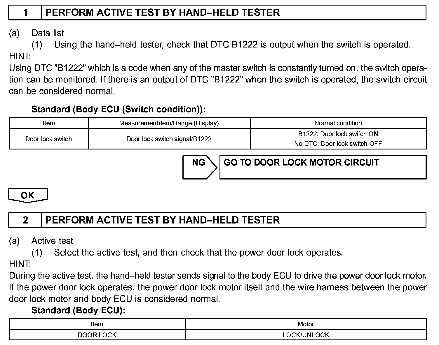 NOTE: Power door lock system use a large-scale body multiplex communications. First of all, confirm the communication function depending on the "how to proceed with troubleshooting", and check that there is no abnormality in the communication system. Then finally proceed with the troubleshooting. Confirm the diagnostic code before troubleshooting.