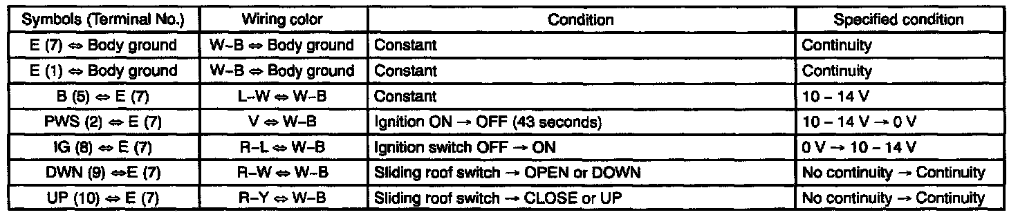 1. After turning the ignition switch from ON to OFF, check that the roof glass can be operated via the sliding roof switch, however the operation will be impossible after the driver's or passenger's door is opened.