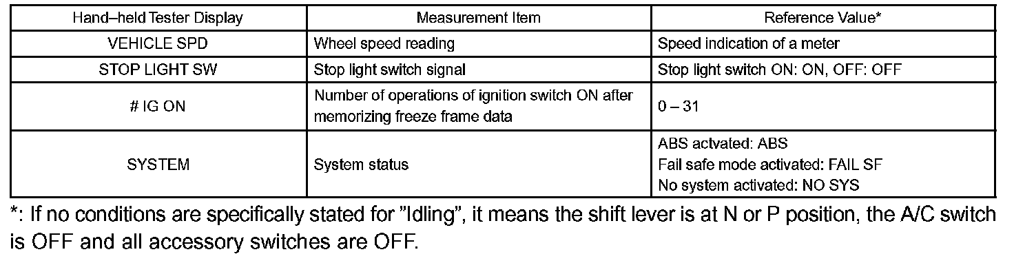 FREEZE FRAME DATAa. The vehicle (sensor) status at the occurrence of abnormality of the diagnosis code and during the ABS operation can be memorized and displayed using the hand-held tester.