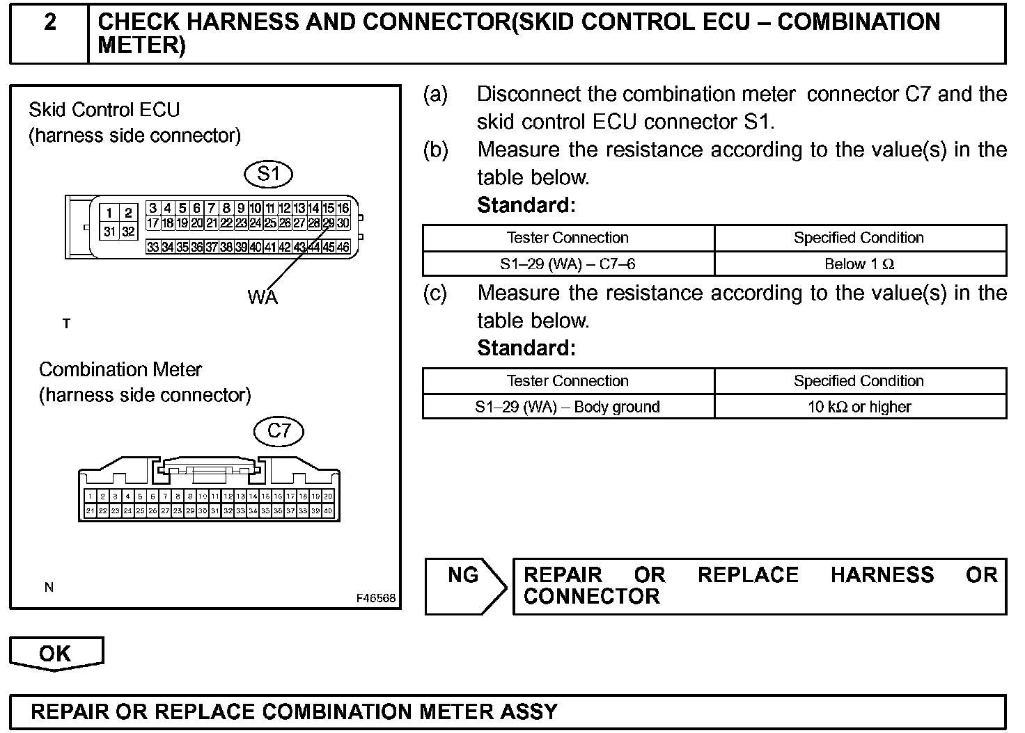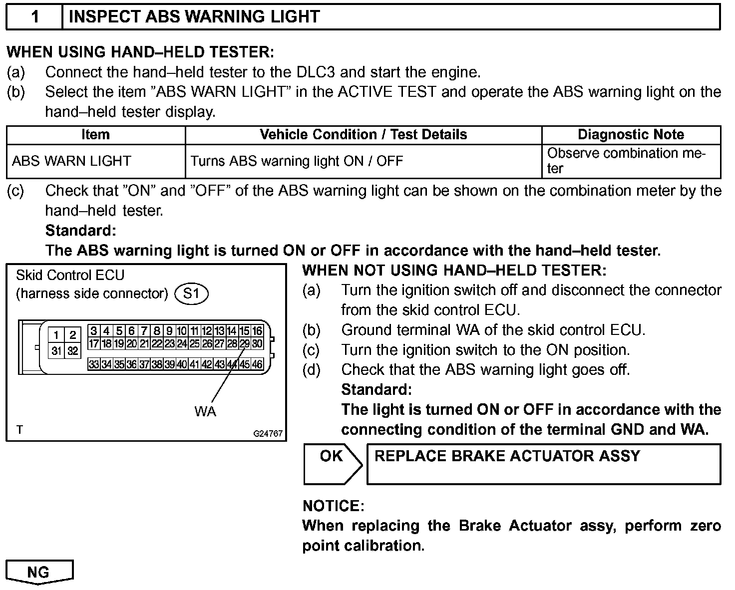 If the ECU detect trouble, it will prohibit ABS control, turn on the ABS warning light, and store the DTC. Connect terminals TC and CG of the DLC3 to make the ABS warning light blink and output the DTC.