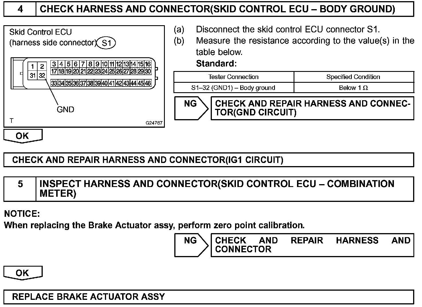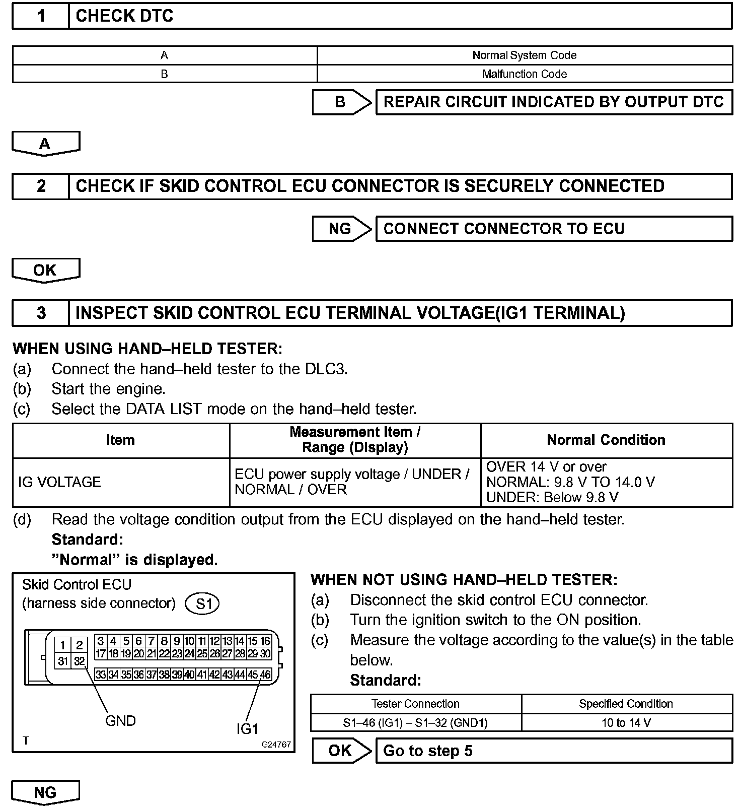 If the ECU detect trouble, it will prohibit ABS control, turn on the ABS warning light, and store the DTC. Connect terminals TC and CG of the DLC3 to make the ABS warning light blink and output the DTC.