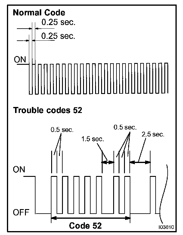 4. Read and record DTCs from the CRUISE MAIN indicator light on the combination meter. As examples, refer to the chart for the blinking of the normal code and trouble code 52.