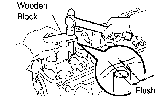 a. Using a wooden block and hammer, tap in 2 new PCV pipes until their top edges are flush with the cylinder head edge.