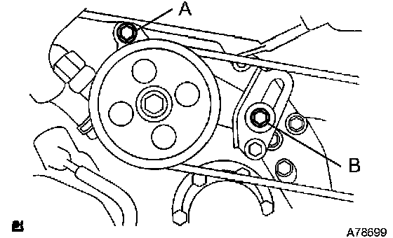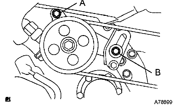 a. Loosen bolts A and B, then remove the V-ribbed belt.