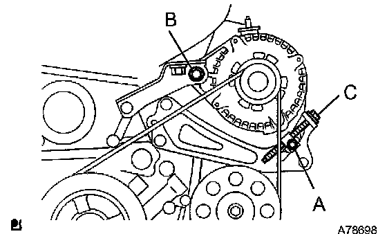 b. Tighten the adjusting bolt C, then adjust the V-ribbed belt tension.