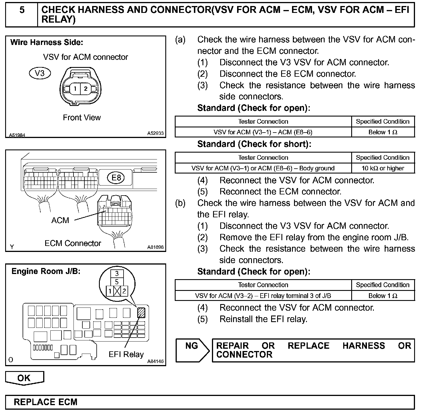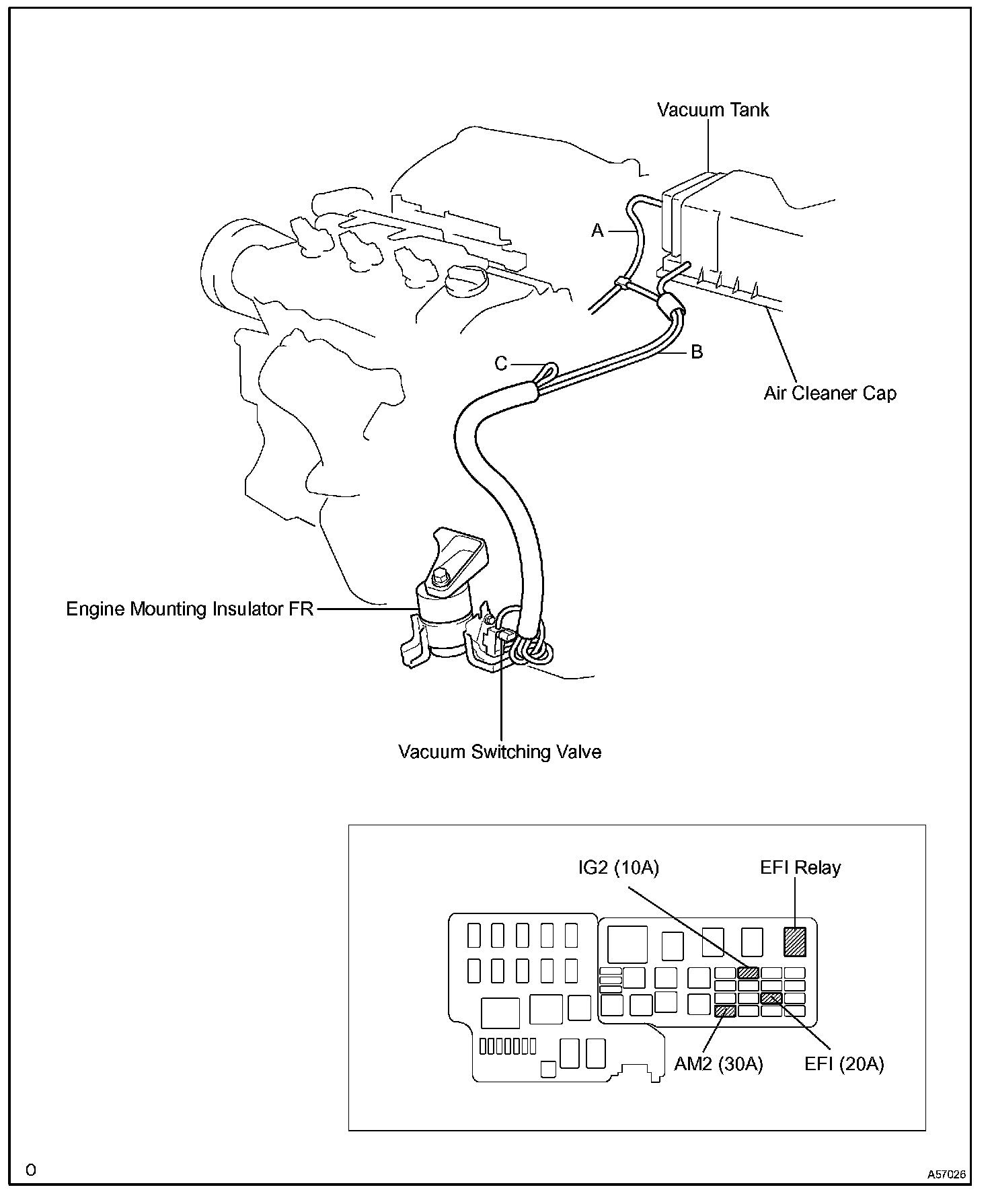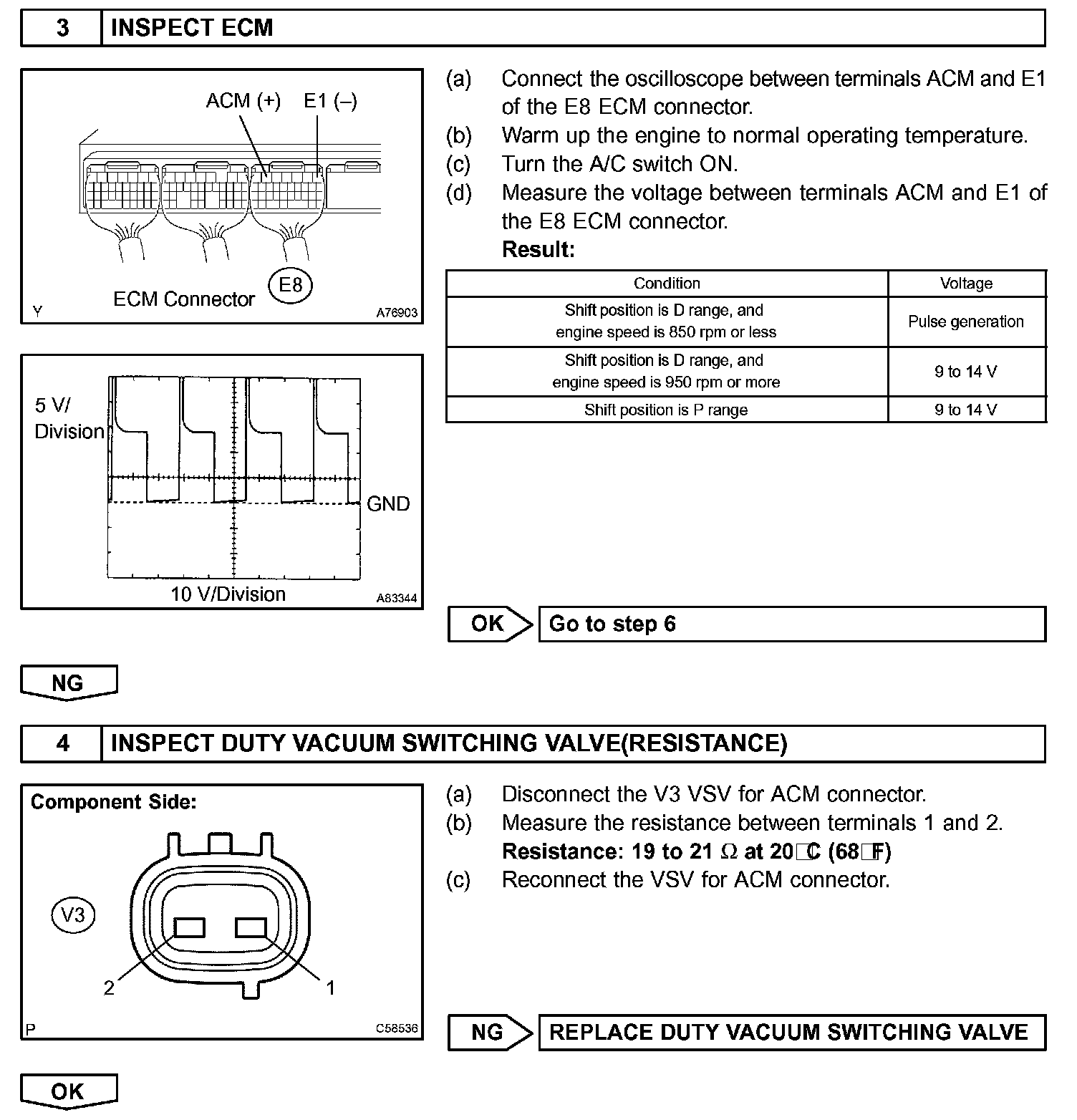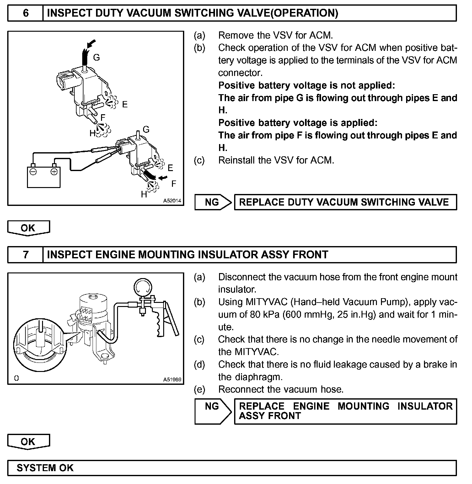 The Active Control Engine Mount (ACM) system decreases engine vibration at low engine speed using the ACM VSV. The VSV is controlled by a pulse signal transmitted to the VSV from the ECM. The frequency of this pulse signal is matched to the engine speed to decrease engine vibration.