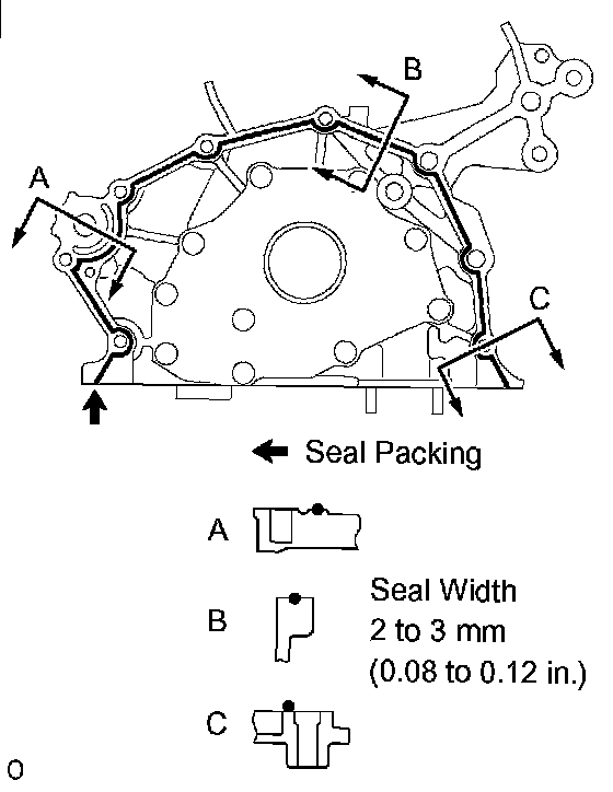 c. Apply a continuous bead of seal packing (Diameter 2 to 3 mm (0.08 to 0.12 inch)) as shown in the illustration.