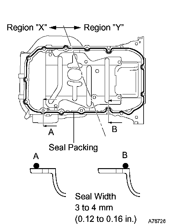b. Apply a continuous bead of seal packing (Diameter 3 to 4 mm (0.12 to 0.16 inch)) as shown in the illustration.