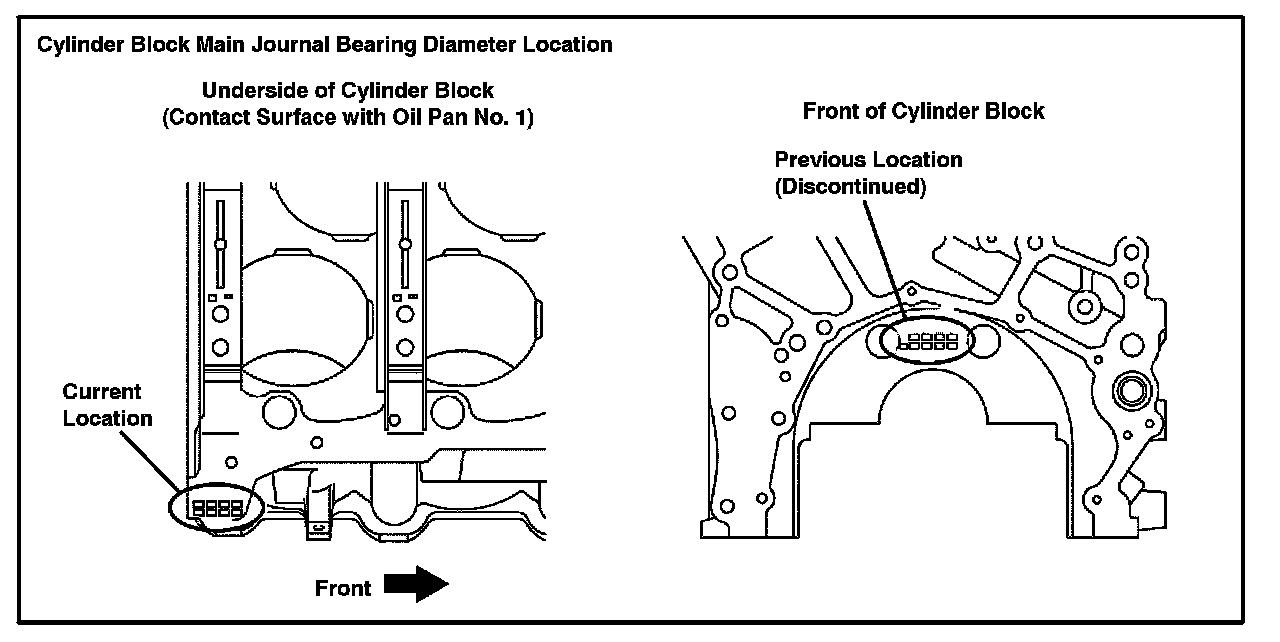 The main bearing journal diameter stamp location has been changed on some 2004 and 2005 model year vehicles with 3MZ-FE engines. The stamping on the front of the block has been discontinued. Review this TSB for the stamping location.