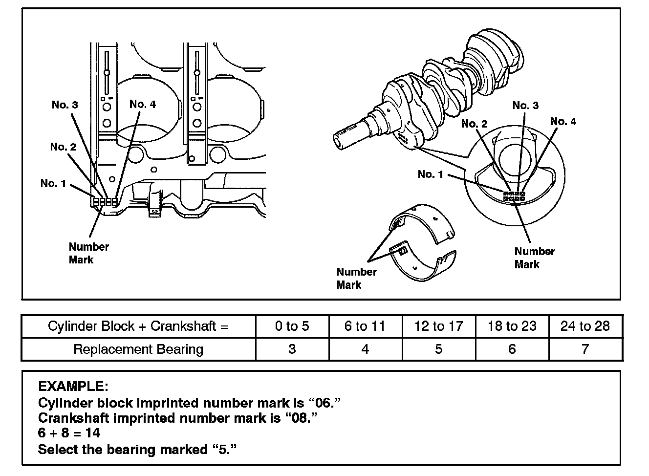 If replacing a bearing, replace it with one that has the same number. If the number of the bearing cannot be determined, select the correct bearing by adding together the numbers imprinted on the cylinder block and crankshaft, then refer to the table on the bottom of this page for the appropriate bearing number. The No. 1 and No. 4 journal bearings have 5 standard bearing sizes, marked 3, 4, 5, 6, and 7 accordingly.