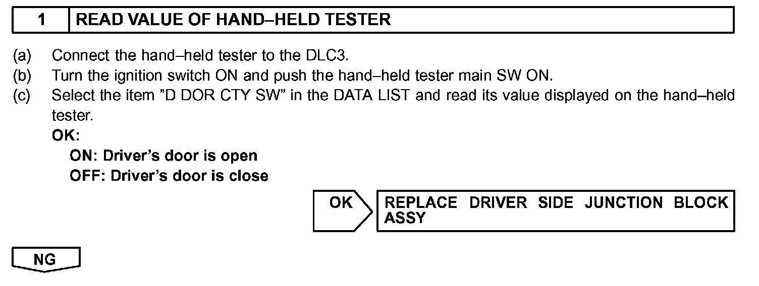 Driver's side courtesy switch signals are transmitted to the body ECU. When the key is in the ignition switch lock cylinder, then, once the driver's door is opened, the body ECU commands the meter ECU to sound the buzzer and the buzzer inside the meter ECU sounds.