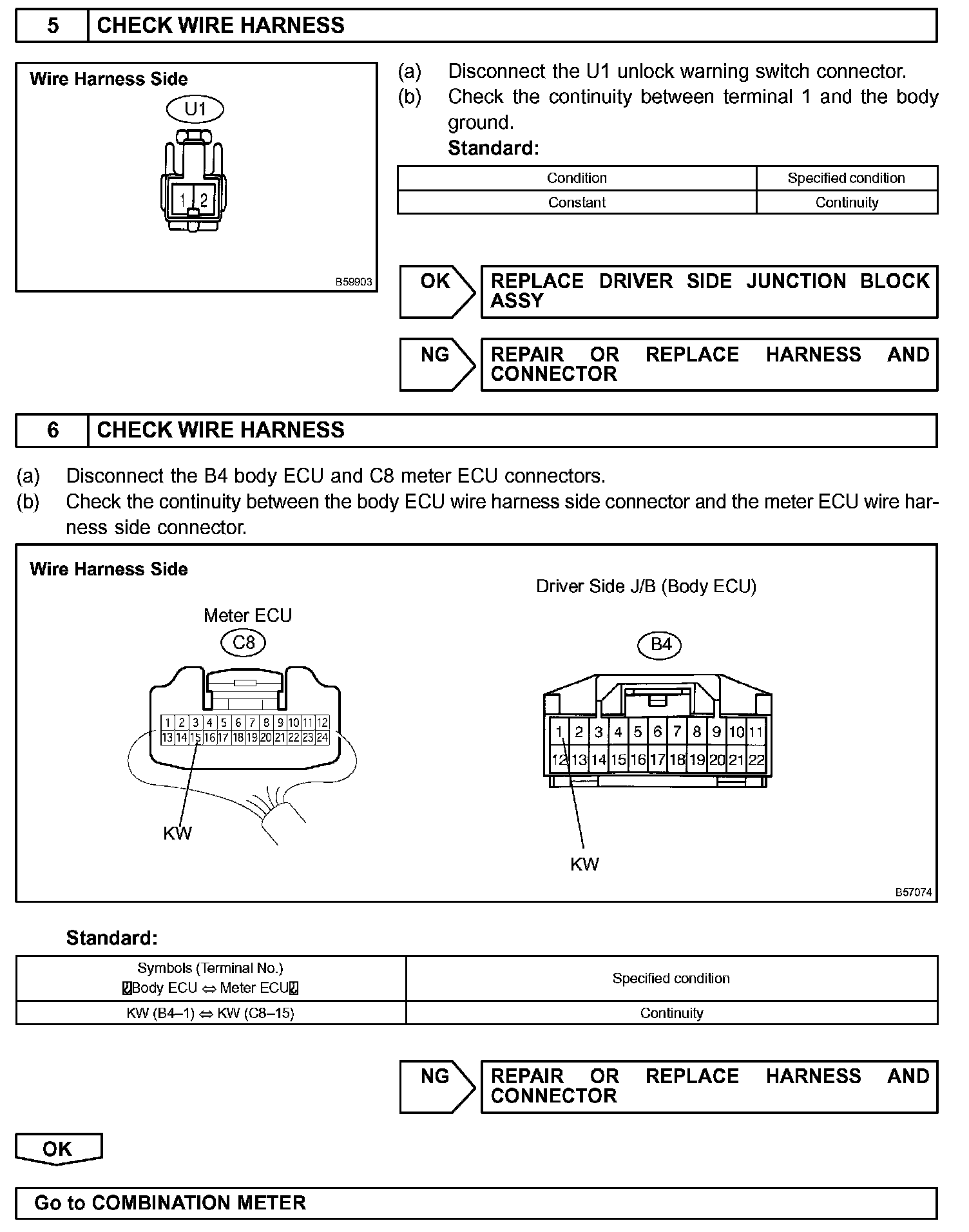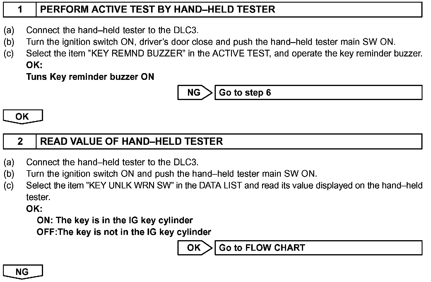 Driver's side key warning switch signals are transmitted to the body ECU. When the key is in the ignition switch lock cylinder, then, once the driver's door is opened, the body ECU commands the meter ECU to sound the buzzer and the buzzer inside the meter ECU sounds.