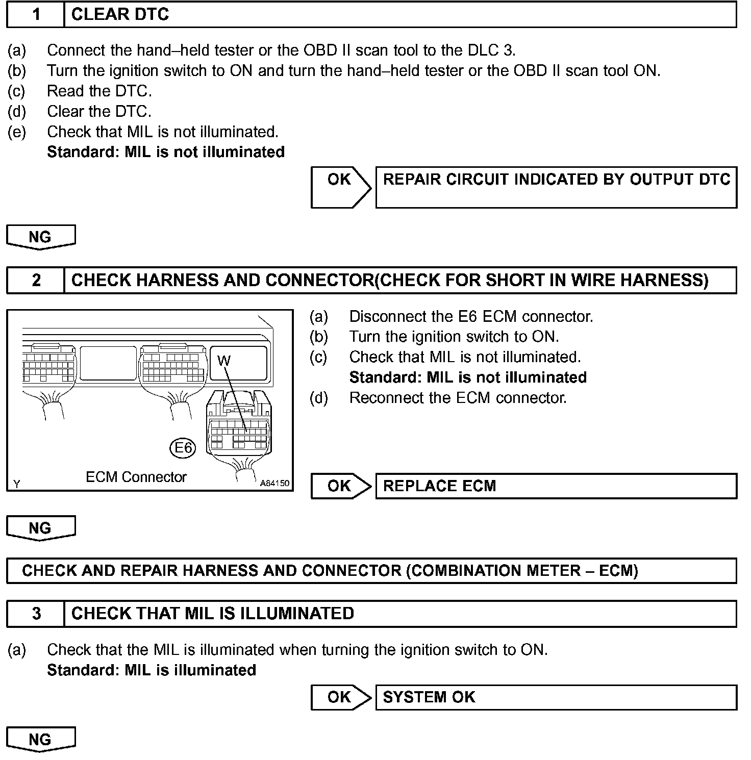 When the ignition is first turned to ON, the MIL should be illuminated. If the MIL is always OFF or ON, use the hand-held tester or OBD II scan tool and follow the procedure below to determine cause of the problem.