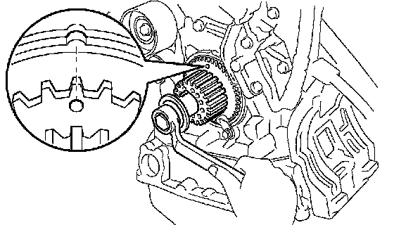 NOTICE: If the timing belt is disengaged, having the crankshaft pulley set at the wrong angle can cause contact of the piston head with the valve head when removing the camshaft timing pulley and camshaft, which causes damage. So always set the crankshaft pulley at the correct angle.