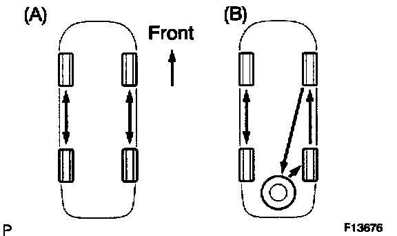 ^ Rotate as shown in (B) if the spare tire is included in the rotation.