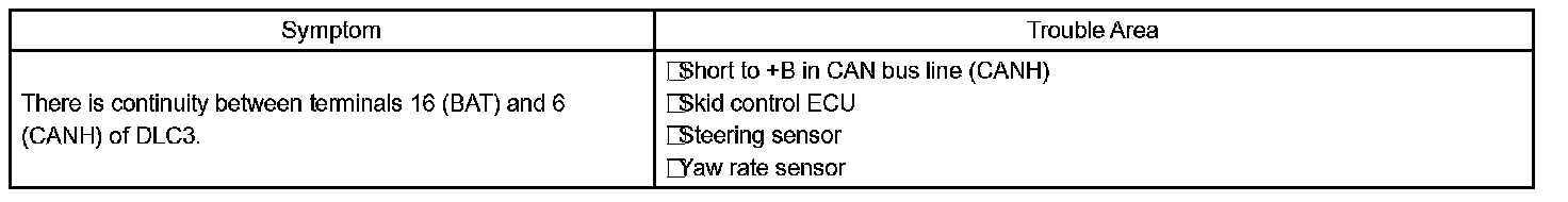 A short to +B is suspected in the CAN bus line when there is continuity between terminals 16 (BAT) and 6 (CANH) of the DLC3.