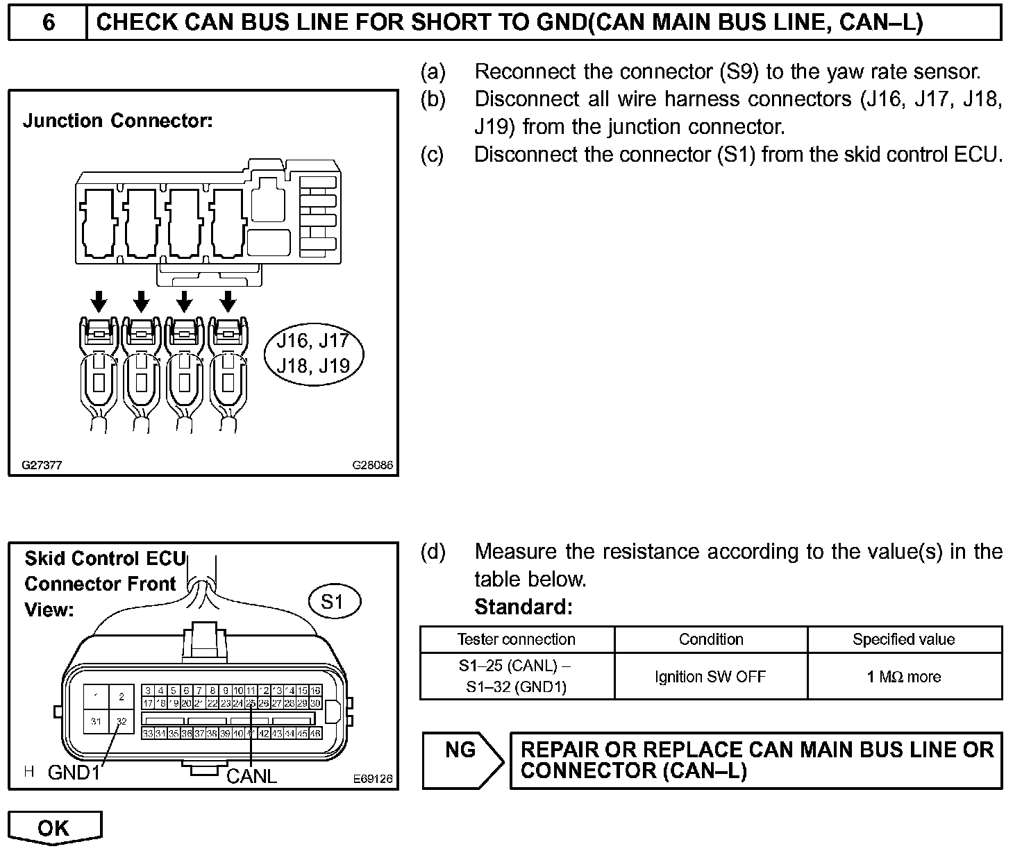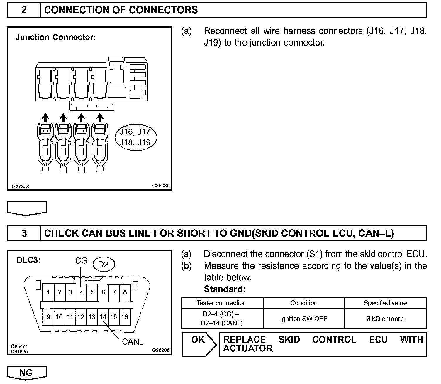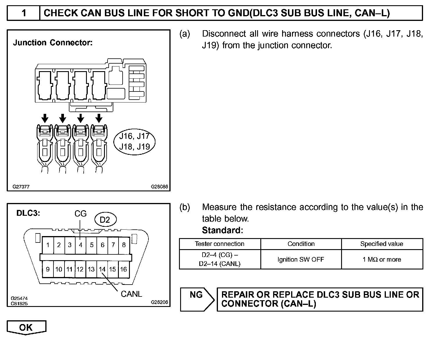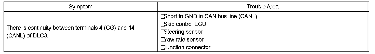 A short to GND is suspected in the CAN bus line when there is continuity between terminals 4 (CG) and 14 (CANL) of the DLC3.