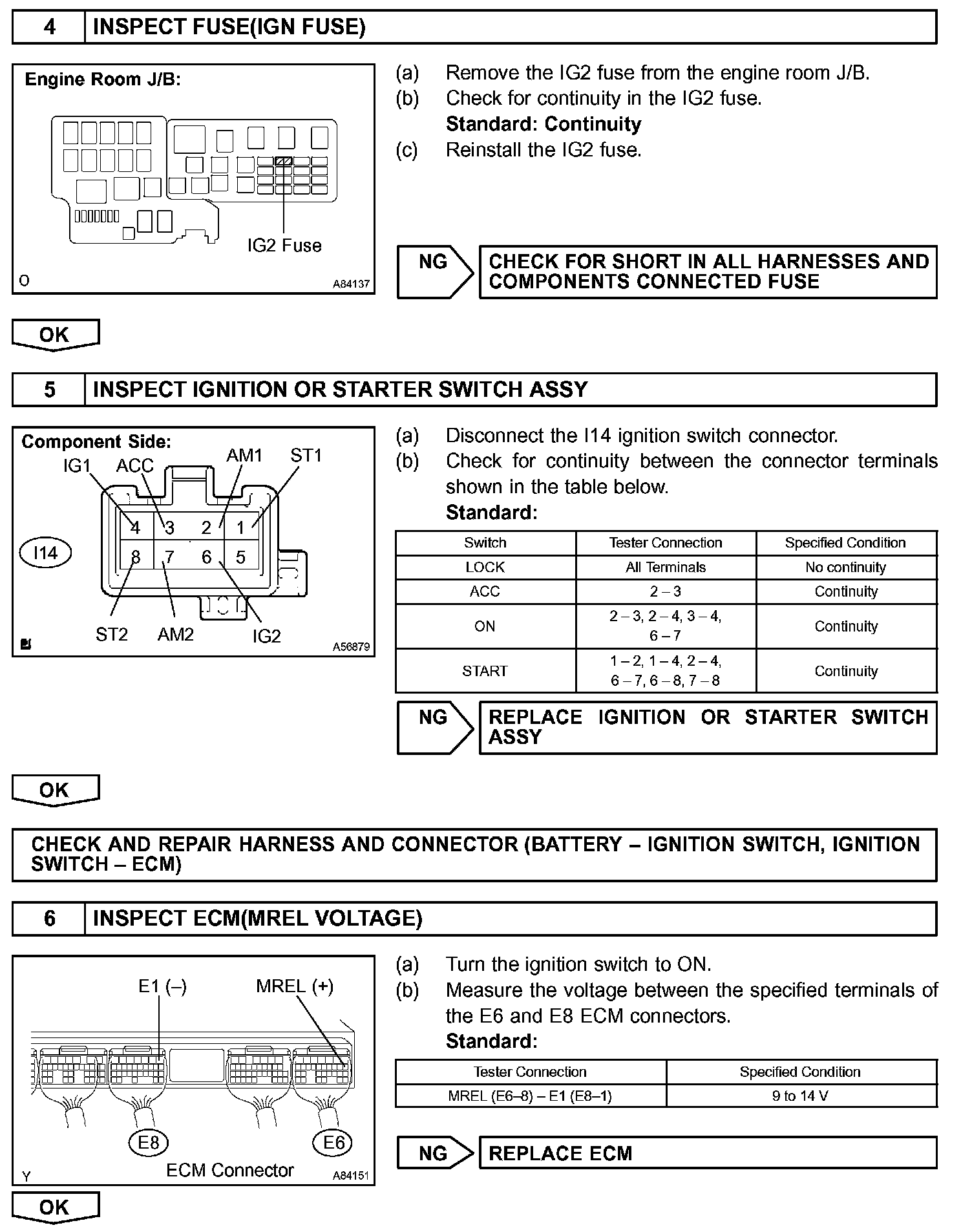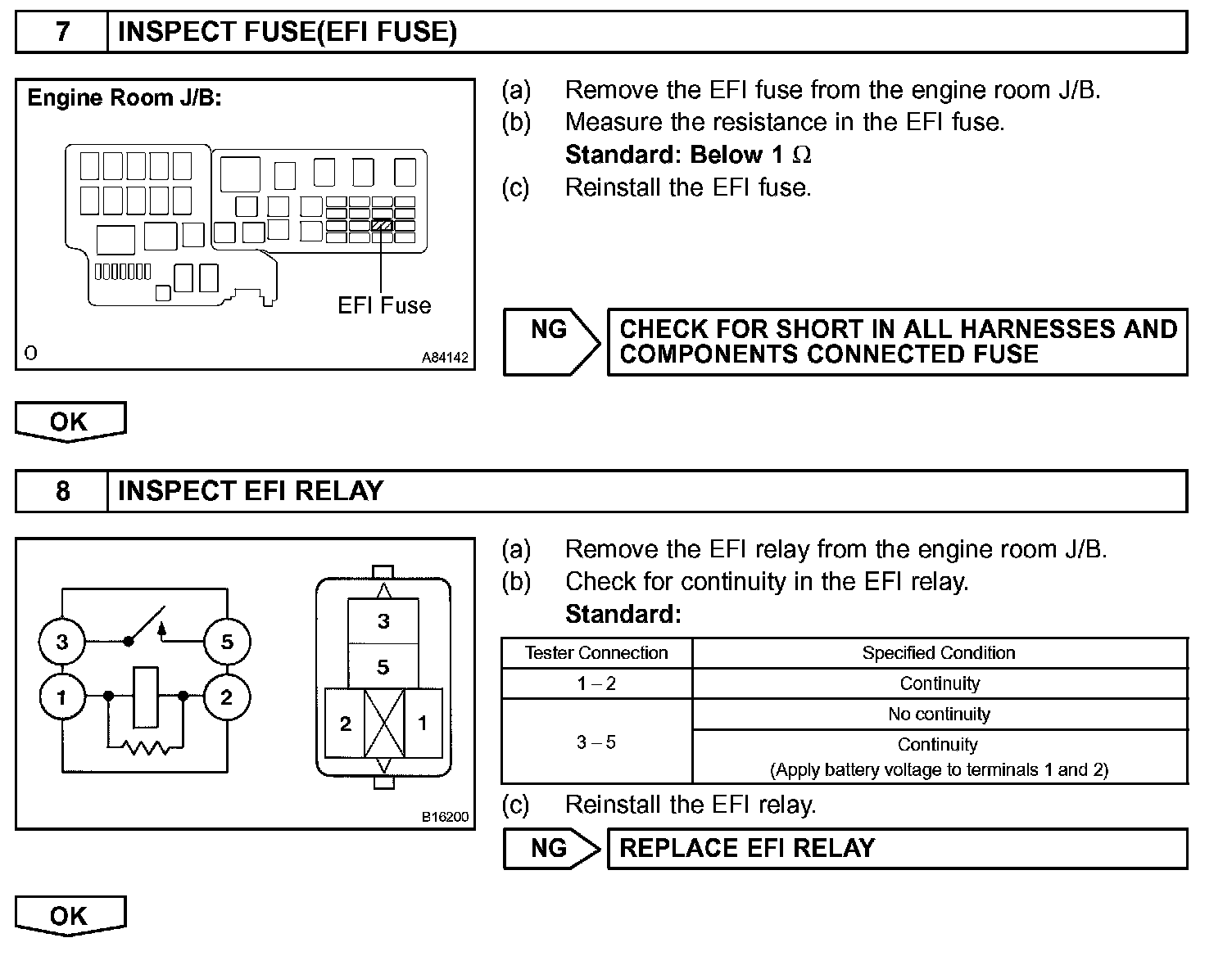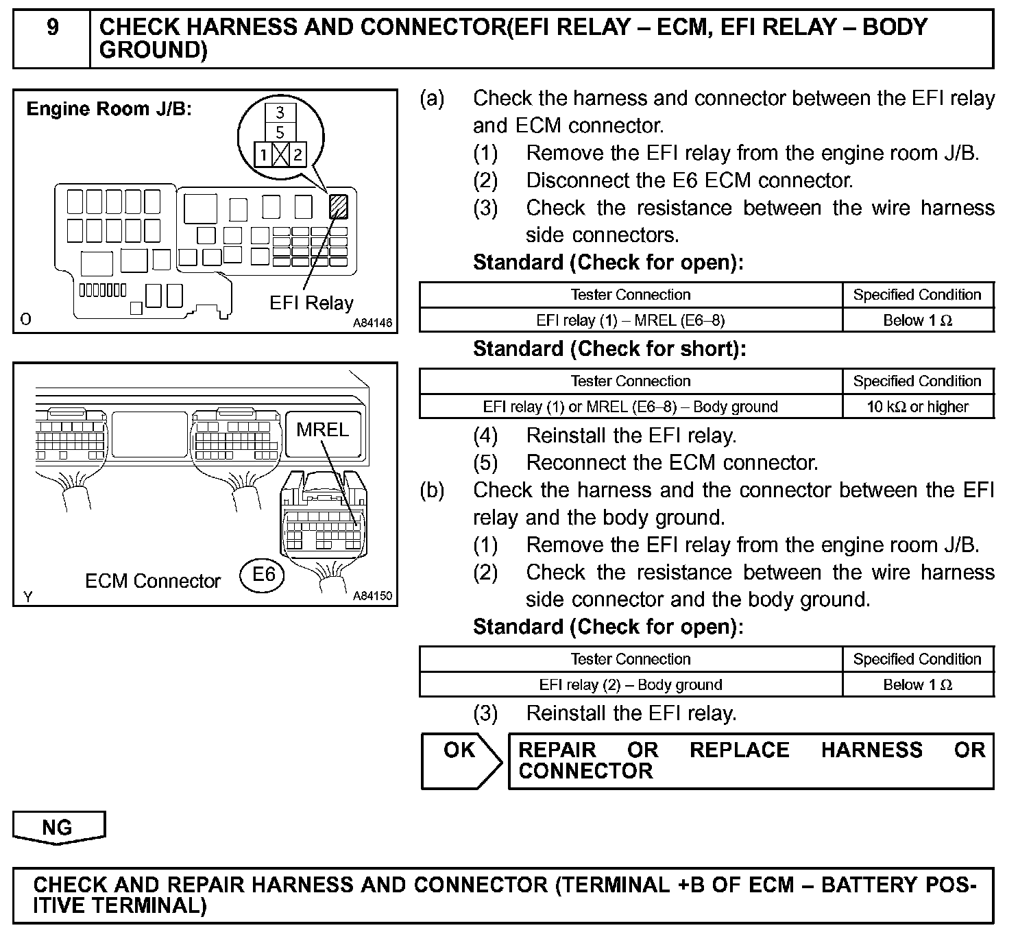 When the ignition switch is turned to ON, battery voltage is applied to terminal IGSW of the ECM. The ECM "MREL" output signal causes current to flow to the coil, closing the contacts of the EFI relay and supplying power to terminal +B of the ECM.