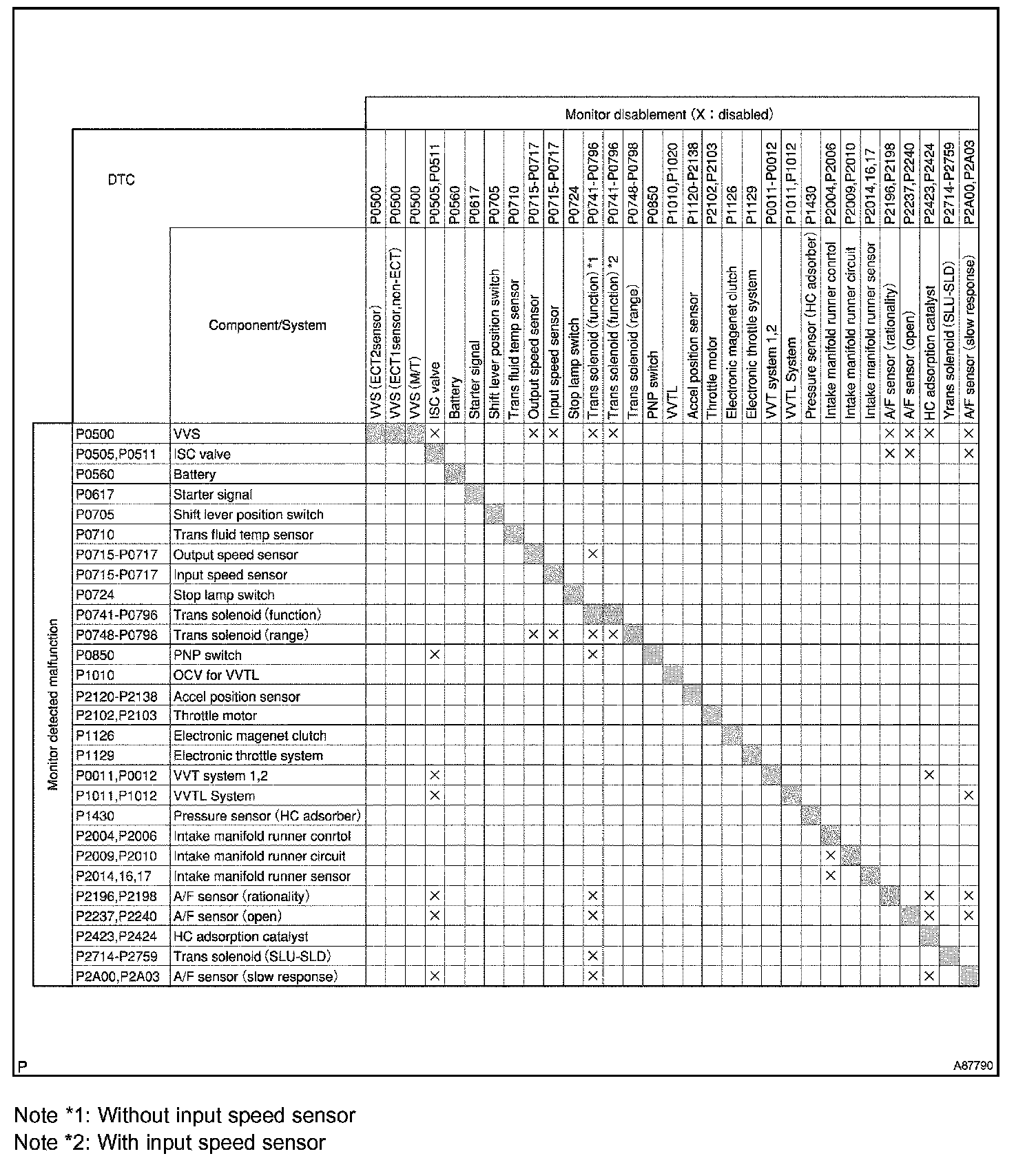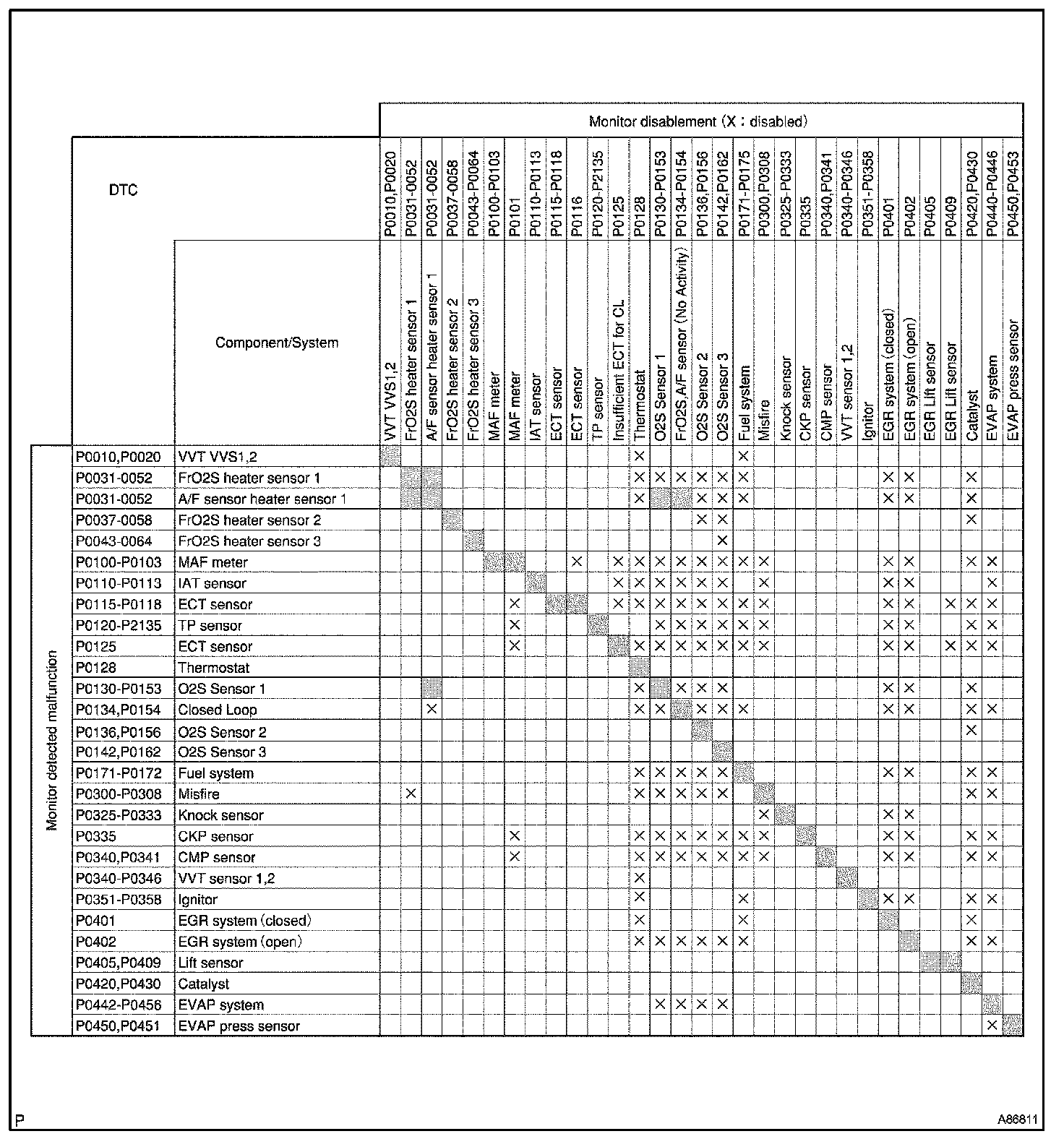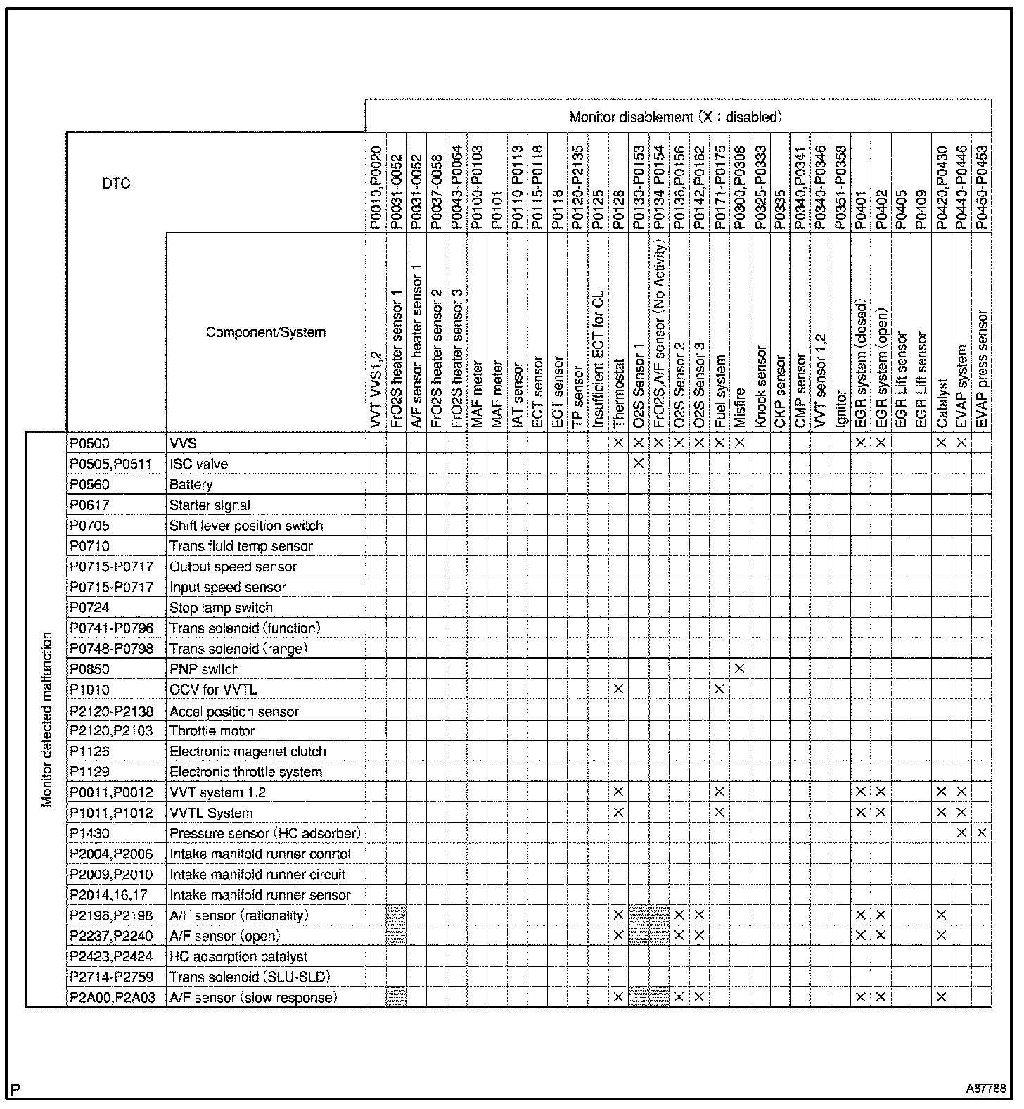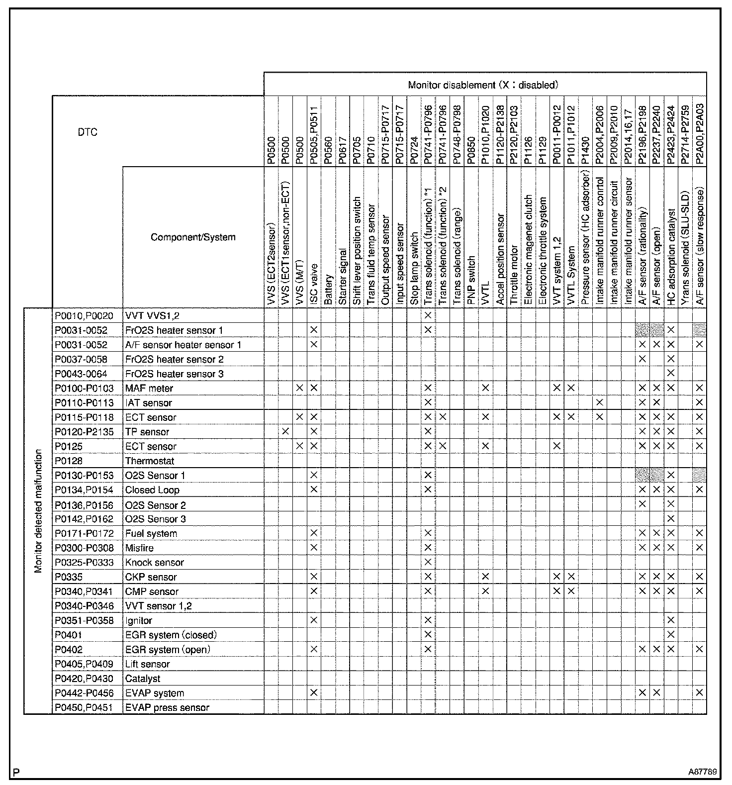 The table shows the ECM monitoring status for the components listed in the top of the table when the DTCs on the left of the table are set.