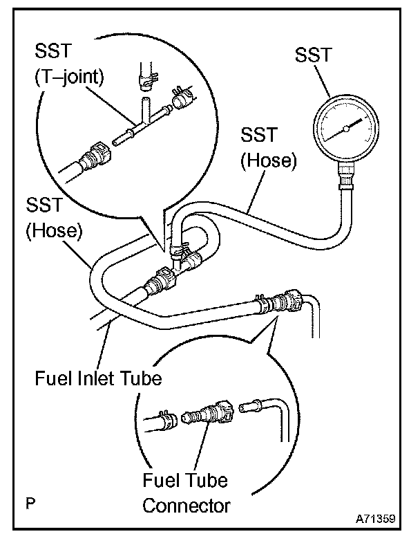 (g) Install SST (a pressure gauge) and fuel tube connector using SST as shown in the illustration.