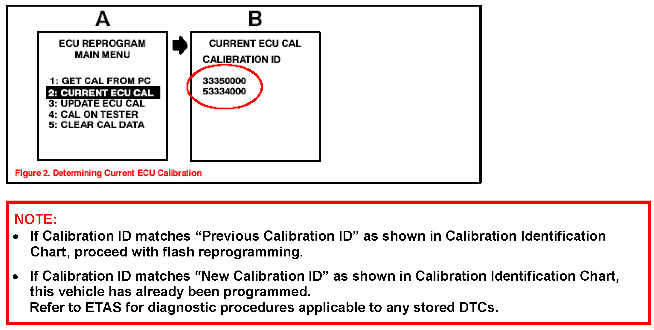 2. Connect the Diagnostic Tester to the vehicle and select CURRENT ECU CAL from the ECU REPROGRAM MAIN MENU. Determine the vehicle's current ECU calibration (see Figure 2).