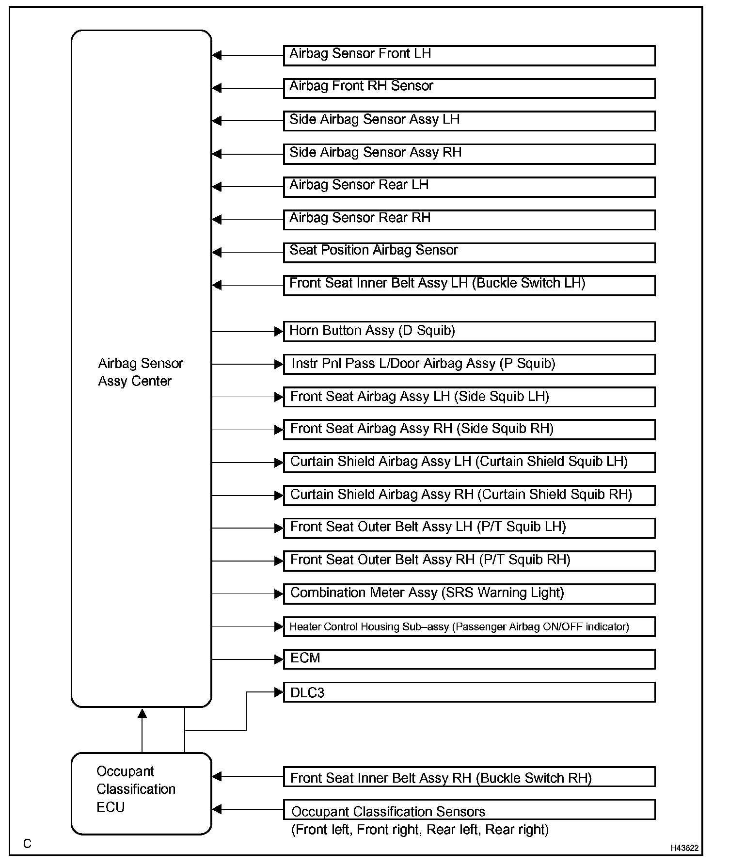 a. In this system, the airbag sensor assy center installed on the floor under the A/C unit determines whether or not to activate the SRS airbags (driver airbag, passenger airbag, side airbags and curtain shield airbags) and seat belt pretensioners by receiving the collision signal from each sensor (excluding the airbag sensor assy center).