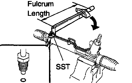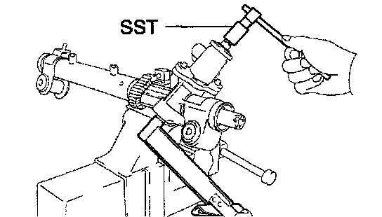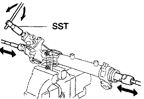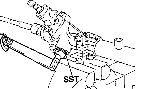 ^ Using SST, hold the power steering rack and install the steering rack end sub-assy.
