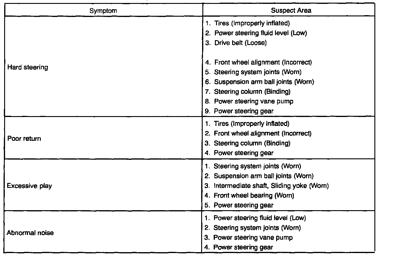 PROBLEM SYMPTOMS TABLEUse the table shown to help you find the cause of the problem. The numbers indicate the priority of the likely cause of the problem. Check each part in the order shown. If necessary, repair or replace these parts.