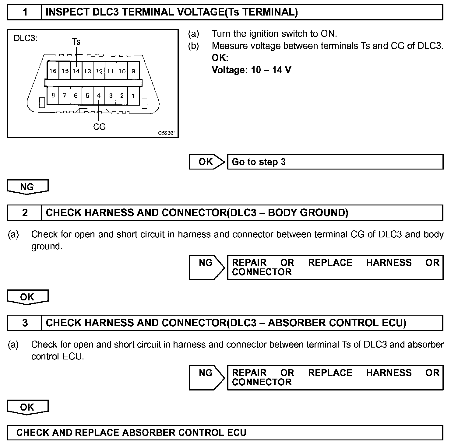 After making short circuit between terminal Ts and CG of DLC3 with the ignition switch turned OFF, the mode will change from normal mode to test mode when the ignition switch is turned ON. After the ignition switch is turned ON, there will be DTC output from TEM terminal of DLC3.