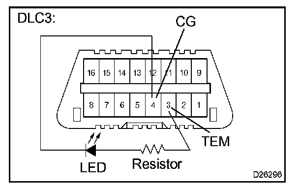 1. Connect the LED and resistor in series between terminals TEM and CG of the DLC3.
