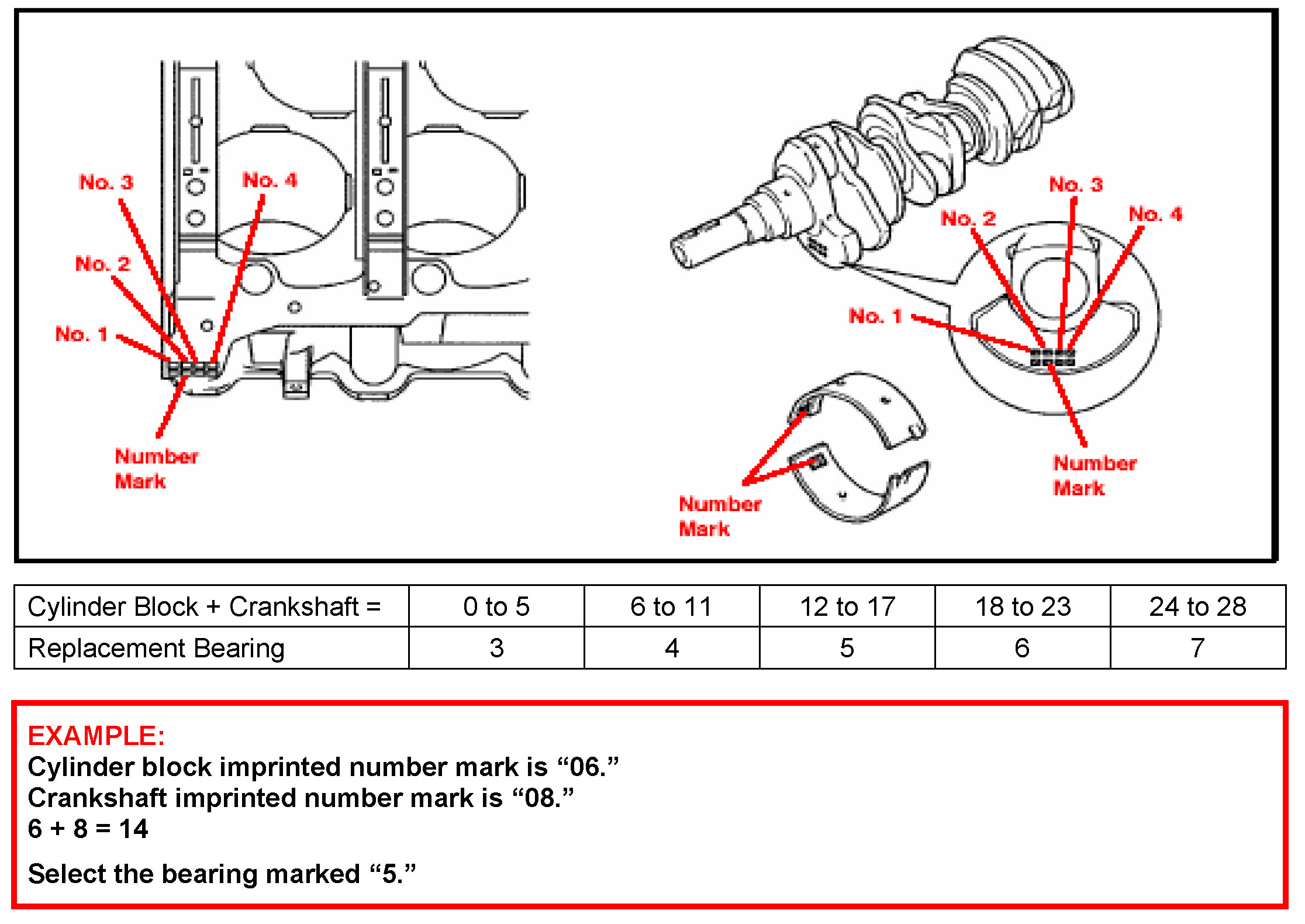 The main bearing journal diameter stamp location has been changed on some 2004 and 2005 model year vehicles with 3MZ-FE engines. The stamping on the front of the block has been discontinued. Review this TSB for the stamping location.