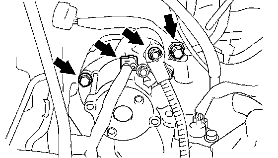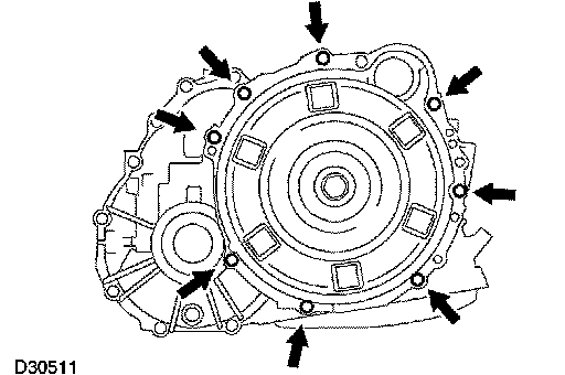b. Turn the crankshaft to gain access and remove the 6 bolts while holding the crankshaft pulley bolt with a wrench.