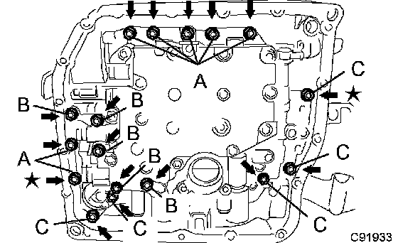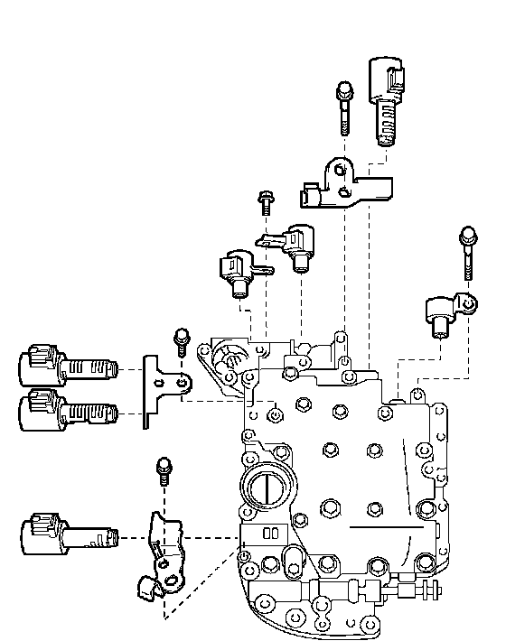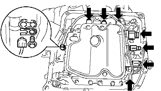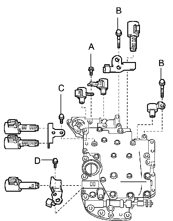 b. Install the 7 shift solenoid valves with the 5 bolts.