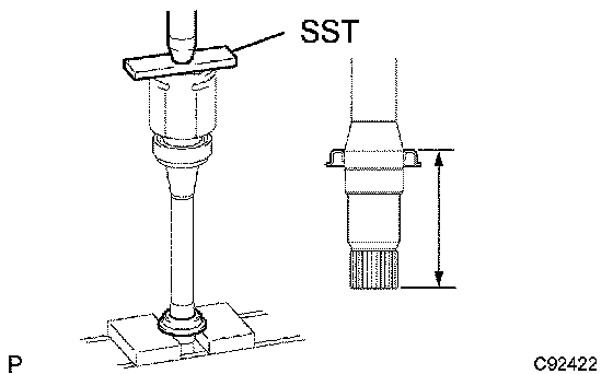 a. Using SST and a press, install a new front drive shaft dust cover until the distance from the tip of the center drive shaft to the front drive shaft dust cover meets the specification, as shown in the illustration.